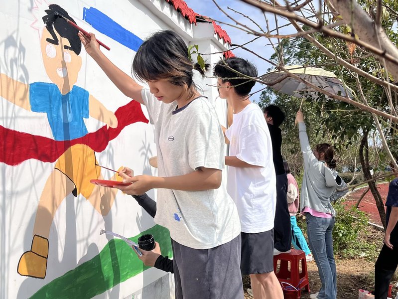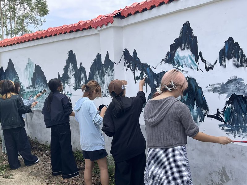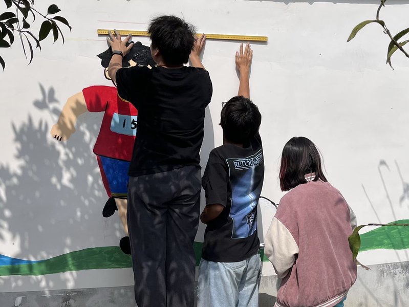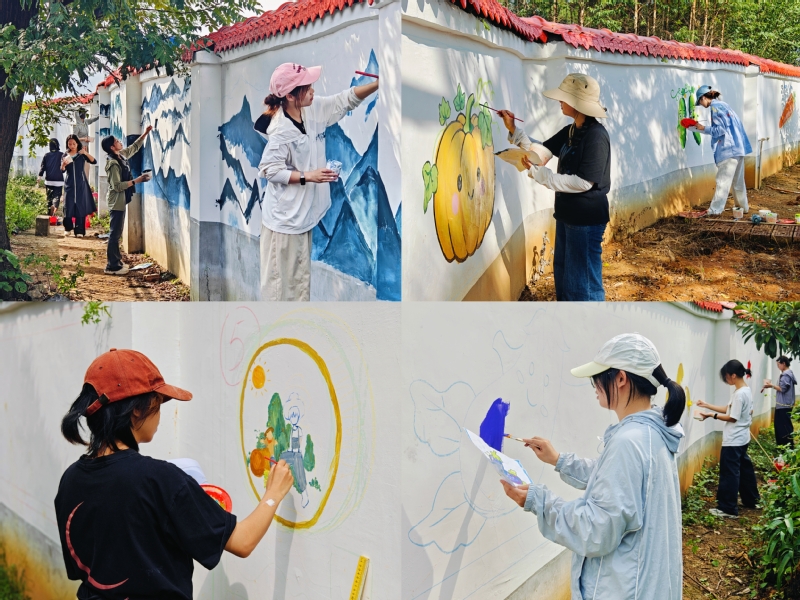 活动现场,美术学院40余名师生组成的创作团队迅速投入创作。调颜料、打底色、勾轮廓、上色块,师生们俯身围墙上,以丙烯为“墨”、以匠心为“笔”,有条不紊地勾勒线条、填充色彩。原本单调的灰色围墙,渐渐焕变为“瓜果童趣”“运动风采”“桂林山水”三组充满想象力的艺术作品——憨态可掬的果蔬卡通、活力满满的运动人物、秀甲天下的桂林山水相映成趣,成为校园里一道兼具童真与地域特色的百米艺术长廊。