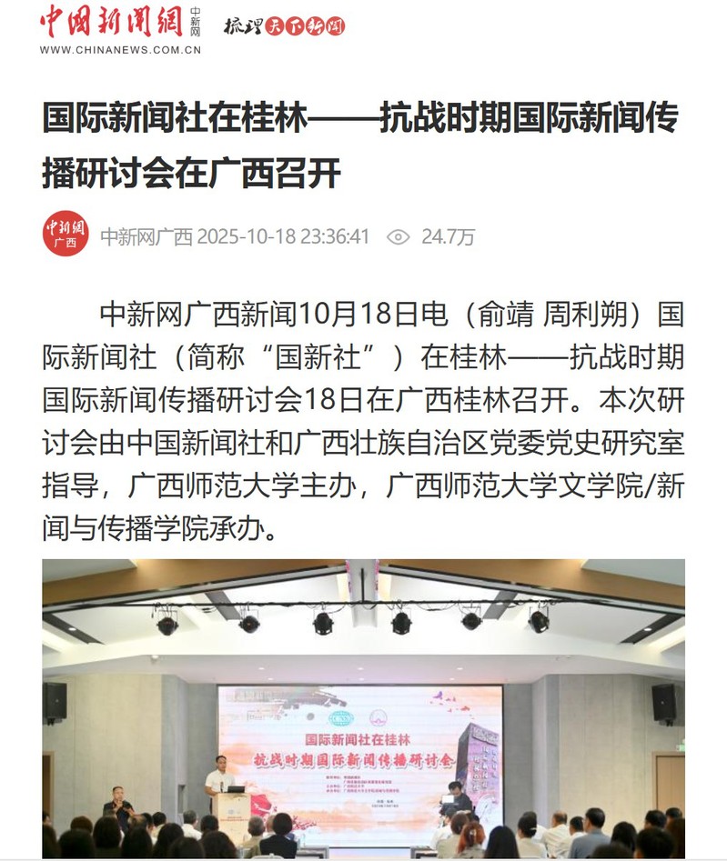 10月18日,【中国新闻网】关注报道国际新闻社在桂林——抗战时期国际新闻传播研讨会在桂林召开。本次研讨会由中国新闻社和广西壮族自治区党委党史研究室指导,广西师范大学主办,广西师范大学文学院/新闻与传播学院承办。我校党委副书记黄文韬表示,希望借本次研讨机会,梳理国新社的“桂林实践”经验,推动新时代国际传播能力建设。
