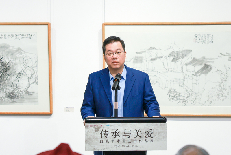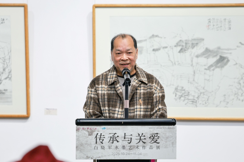美术学院行政相关负责人、广西师范大学美术馆馆长表示,白晓军教授为学院学科与人才培养贡献卓著,退休后仍借关工委工作助力青年教育。他表示,此次展览是学校“高雅艺术文明校园”活动组成部分,“传承与关爱”主题契合白晓军教授育人理念与美术学院院训精神,其“三老”理念更是对传统技艺与人文记忆的守护,希望青年教师和莘莘学子能铭记历史、珍惜传统、开创未来,为推动学院事业高质量发展贡献智慧和力量。