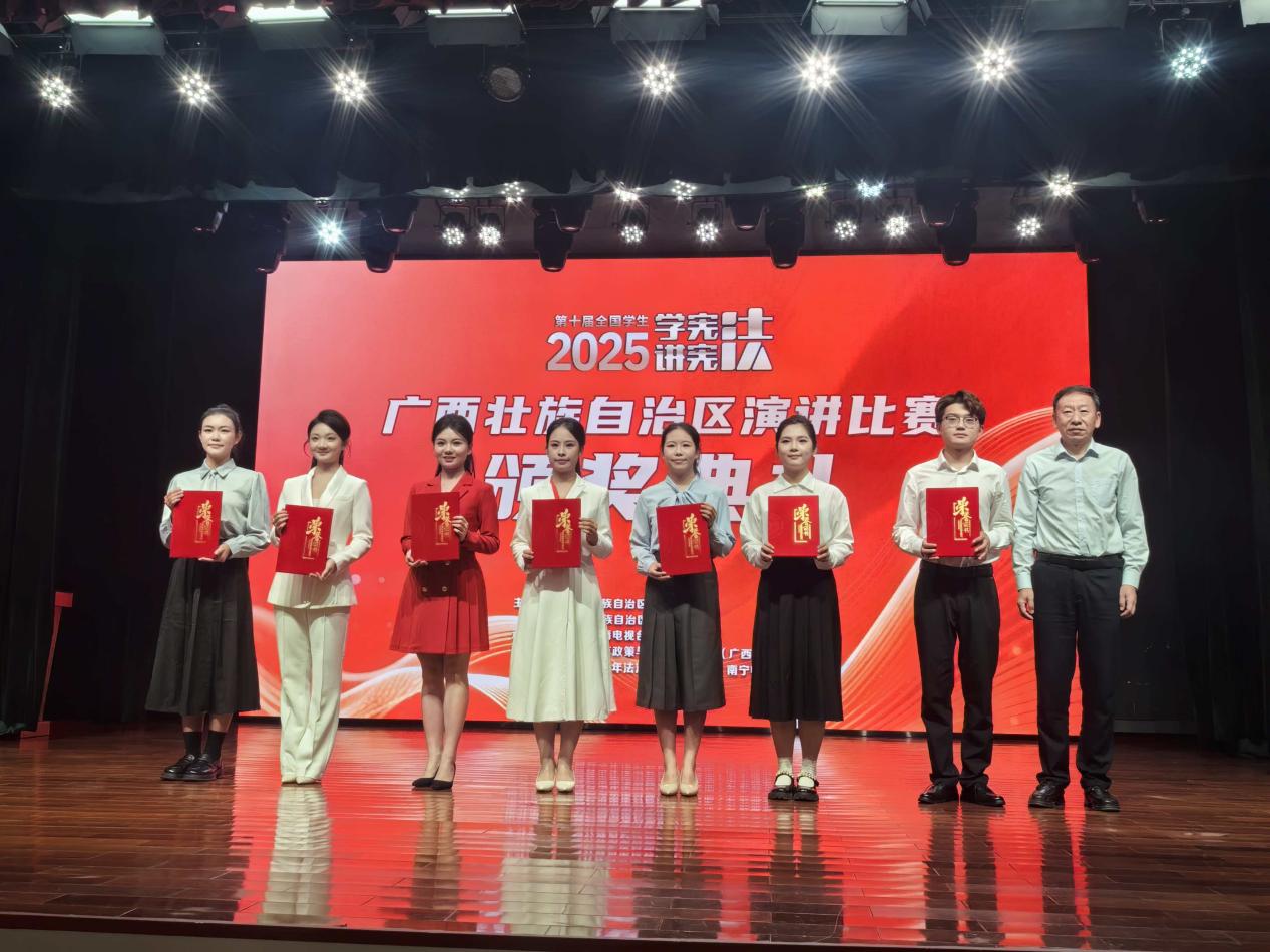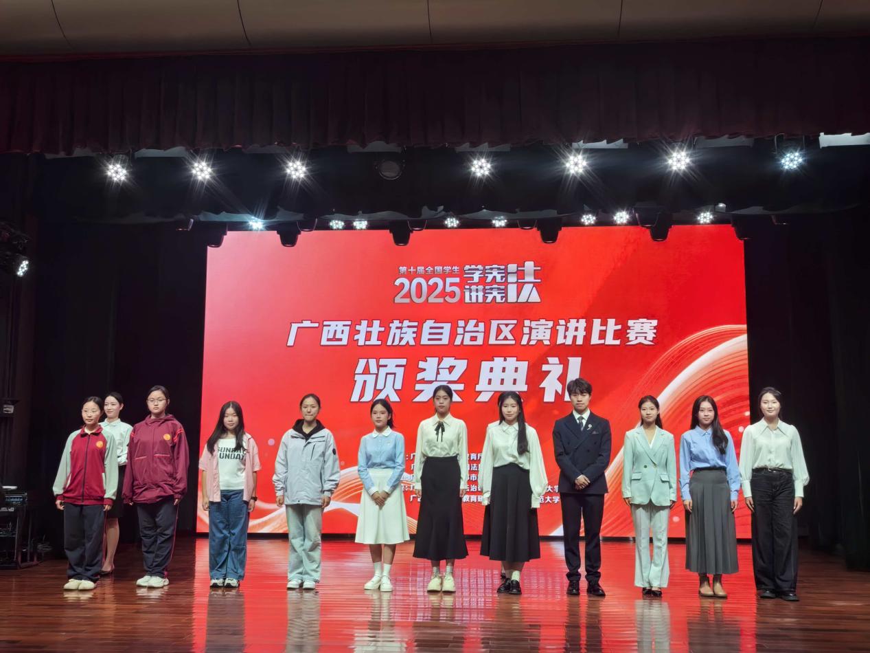 10月24日,由广西壮族自治区教育厅、广西壮族自治区司法厅主办,广西教育政策与法治研究中心(广西师范大学)、广西青少年法治教育研究基地(南宁师范大学)协办的2025年全区学生“学宪法 讲宪法”素养竞赛、演讲比赛决赛在广西广播电视台圆满落幕。我校学子在本届比赛中表现优异,斩获多项奖励。其中,法学院/律师学院马鑫在素养竞赛中以总分第一名的成绩荣获一等奖;文学院/新闻与传播学院陈楠淑、体育与健康学院周鼎力分获演讲比赛二等奖、三等奖,充分展现了我校学子深厚的法治素养和昂扬的精神风貌。