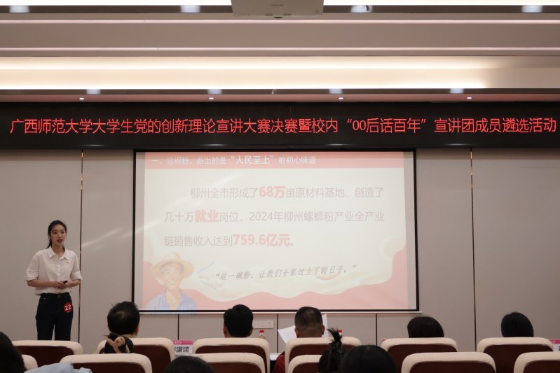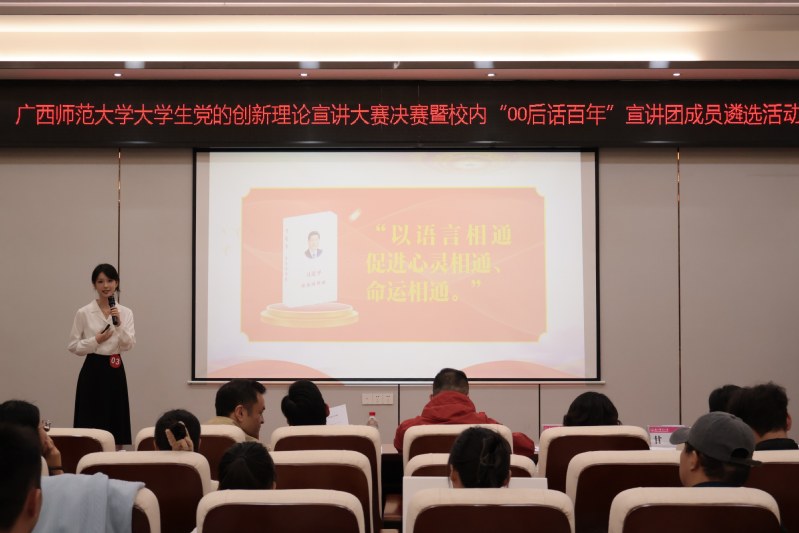 10月23日,决赛在雁山校区落幕。经各学院(部)、各部门初赛层层选拔,26名优秀选手脱颖而出登上决赛舞台。选手们紧扣党的创新理论核心,聚焦《习近平谈治国理政》第五卷的精髓要义,既精准阐释理论内涵,又善用中国故事、广西实践等鲜活素材,以兼具理论深度与表达魅力的“青言青语”,让宏大理论变得可感可触、入脑入心。赛程特别设置示范宣讲环节,邀请自治区“00后话百年”宣讲团成员现场展示,为参赛选手提供了宝贵的学习范本。马克思主义学院副教授卢俞成对选手表现进行专业点评,六十余名师生代表到场观赛,现场反响热烈。