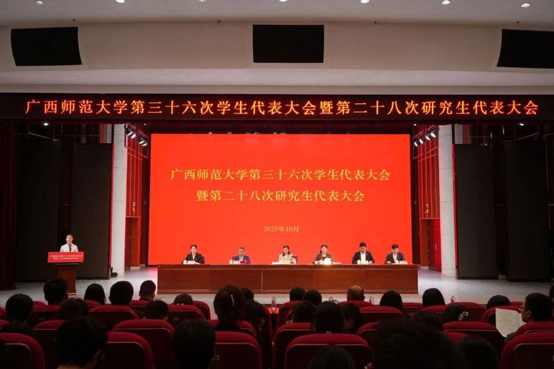 2025年10月25日上午,广西师范大学第三十六次学生代表大会暨第二十八次研究生代表大会在雁山校区音乐学院三楼综合厅召开。校党委常委、副校长沈星灿出席开幕会并讲话。学工部(处)、研工部、校团委主要负责人,桂林市兄弟高校学生会、研究生会代表,各学院(部)团委书记,400 余名本科生、研究生代表齐聚现场,共赴青春盛会。