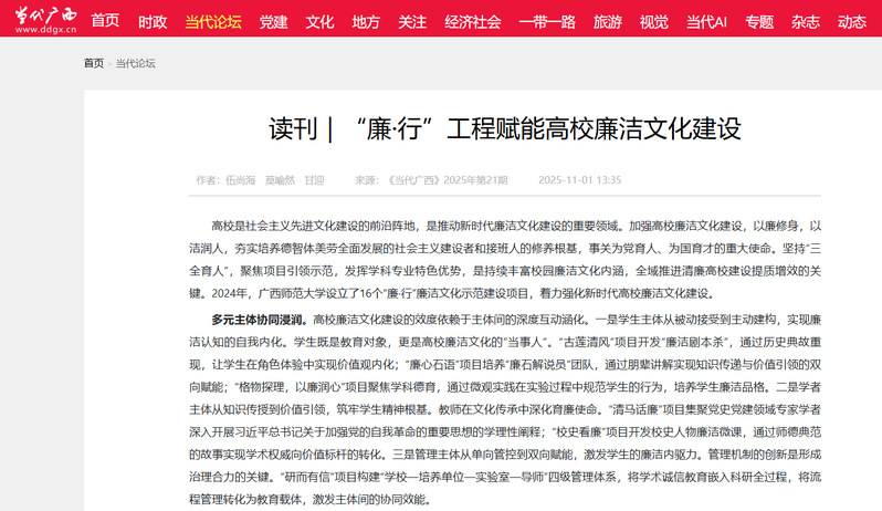 近日,《当代广西》【学习强国】关注报道我校“廉·行”工程赋能高校廉洁文化建设。文章聚焦我校2024年首批16个示范项目,通过多元主体协同、学科文化资源“双核”驱动、文化生态动态平衡等创新路径,构建了全方位、立体化的高校廉洁教育新格局,有力推动了高校廉洁文化建设提质增效。