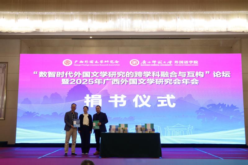 在闭幕式环节,各平行论坛代表依序汇报了本组的研讨成果。上海交通大学出版社外语教材与学术出版中心主任张冠男对外语教材及数字人文出版情况进行了介绍,并向我校和广西大学外国语学院捐赠书籍。广西外国文学研究会副会长兼秘书长彭炫对本次会议进行了全面总结。下一届会议承办方代表梧州学院晏劲松教授向与会代表发出邀请,期待大家于2026年齐聚梧州,共同续写学术交流的美好篇章。
