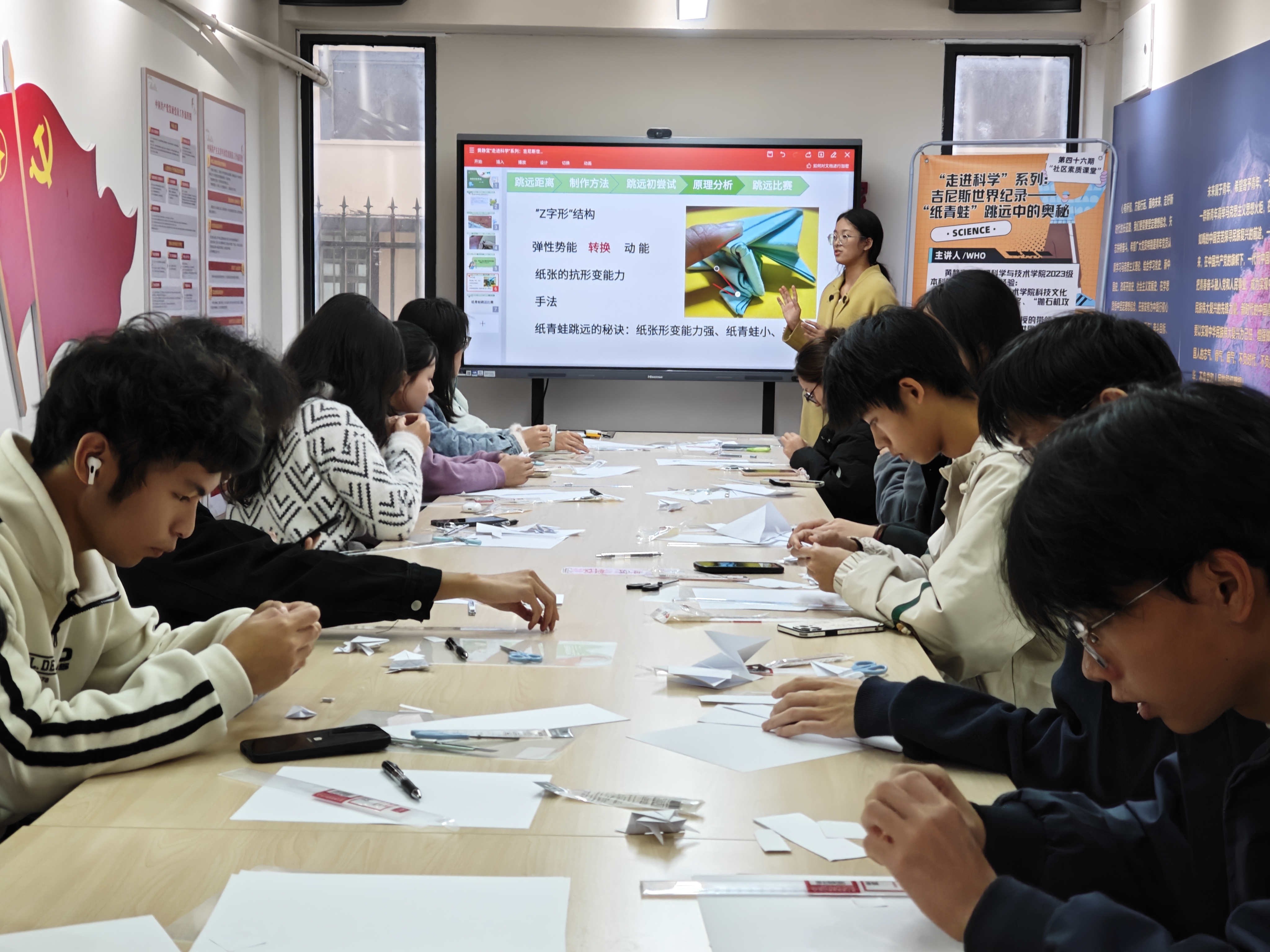 在动手实践环节,现场气氛达到了高潮。同学们不再是简单地模仿折叠,而是带着问题去实验:如何调整腿部结构以获得更大的初始速度?如何设计身体比例以确保平稳着陆?大家一边讨论,一边用不同的纸张和折叠方法进行“对比实验”,学生社区瞬间变成了一个充满欢声笑语的物理实验室。