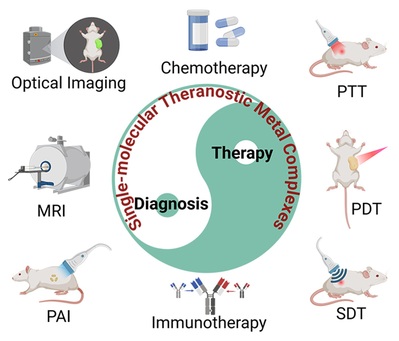 单分子诊疗一体化金属配合物将癌症的“诊断”与“治疗”功能集成于单一分子平台,从而实现癌症的精确靶向、疗效的实时监测和治疗策略的动态调整,显著提高了癌症治疗的效率。该综述分别从分子靶向设计、诊疗策略优化、递送系统开发和抗肿瘤机制探究四个方面对如何开发单分子诊疗一体化金属配合物进行了论述。详细统计了基于钌、铱、铂、金、锌、锰及镧系等金属的诊疗一体化金属配合物,强调了集光学成像、光声成像、磁共振成像等为一体的多模式联合诊断模式的显著优势,以及集化疗、光动力治疗、光热治疗和免疫治疗等多种治疗方式为一体的多模式联合治疗的显著疗效。突出介绍了以内源性蛋白作为单分子诊疗一体化金属配合物的递送载体在增强靶向能力、减少毒副作用和改善药物代谢方面的显著优势。此外,本文还批判性地评估了这一新兴领域的局限性和未来发展方向,强调了通过多学科和创新方法的结合来开发和优化单分子诊疗一体化金属配合物,为开发新一代高效的单分子诊疗一体化金属药物提供有力的支撑。