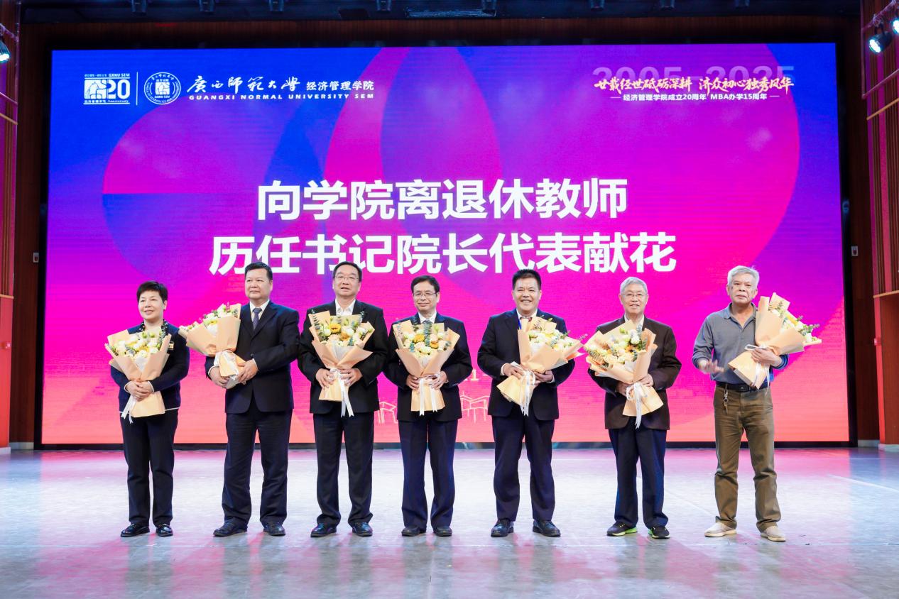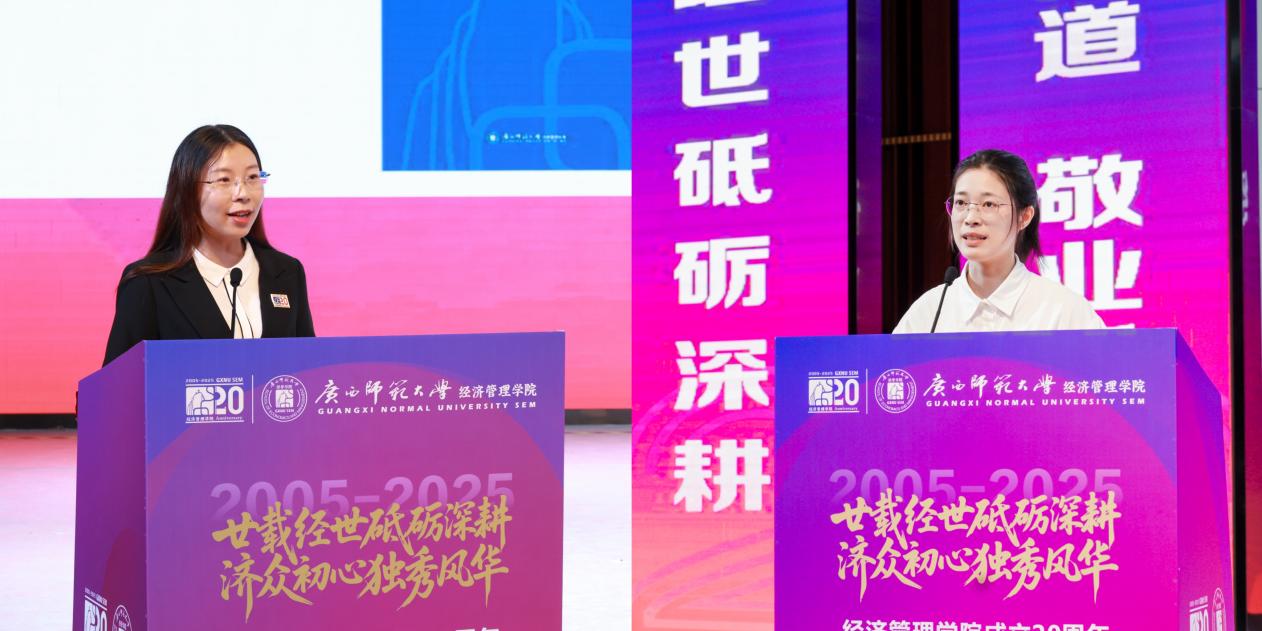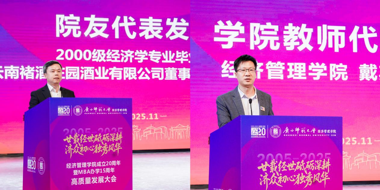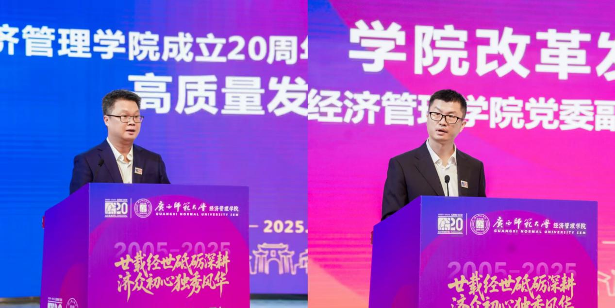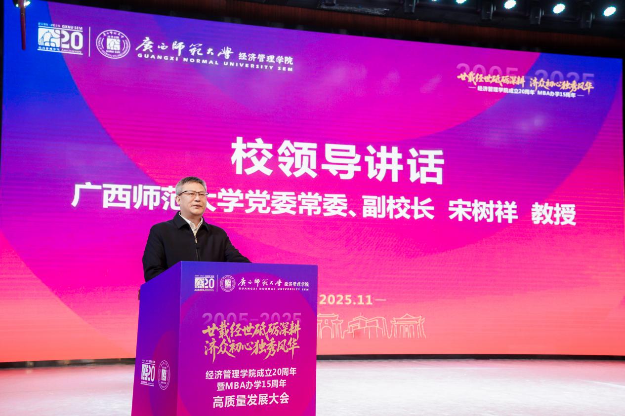 廿载经世砥砺深耕,济众初心独秀风华。11月8日,经济管理学院成立20周年暨MBA办学15周年高质量发展大会在雁山校区音乐学院三楼综合厅举行。广西师范大学党委常委、副校长宋树祥,桂林电子科技大学原总会计师曹辉景出席大会。南京师范大学商学院、桂林电子科技大学商学院等校外兄弟学院主要负责人,校外专家学者代表、行业代表、院友代表,学校职能部门、学院(部)负责人,学院全体教师、离退休教师、学生代表共550余人相聚雁栖湖畔,追忆峥嵘岁月,共绘发展新篇。大会由学院党委书记主持。