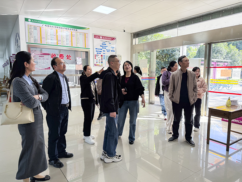 会前,桂电医院一行参观了校医院各个科室。交流座谈会上,校医院负责人对桂电医院一行的到来表示热烈欢迎,并简要介绍了校医院的基本情况,包括人员构成、高级职称占比以及口腔科、针灸理疗科等特色科室的设置。接着,桂电医院负责人介绍了随行人员及此行目的,希望在医院管理、科室建设等方面借鉴学习。双方围绕多校区医疗资源协调、医务人员值班安排、智慧医院小程序开发与应用、共同面临的挑战等进行了深入地探讨。