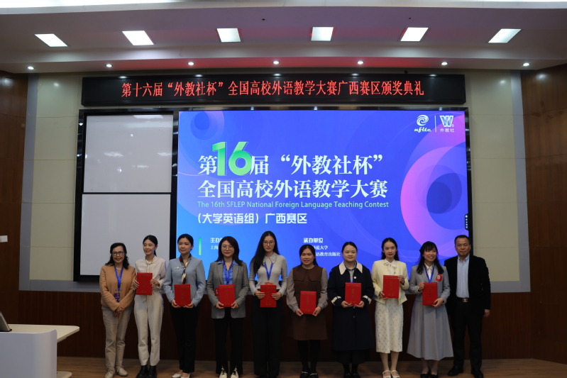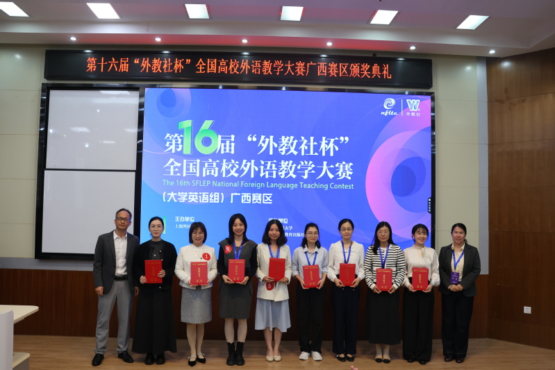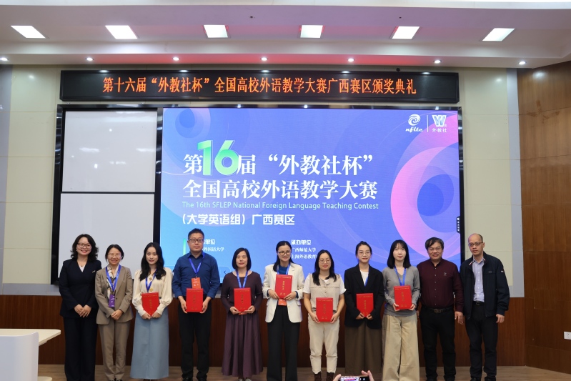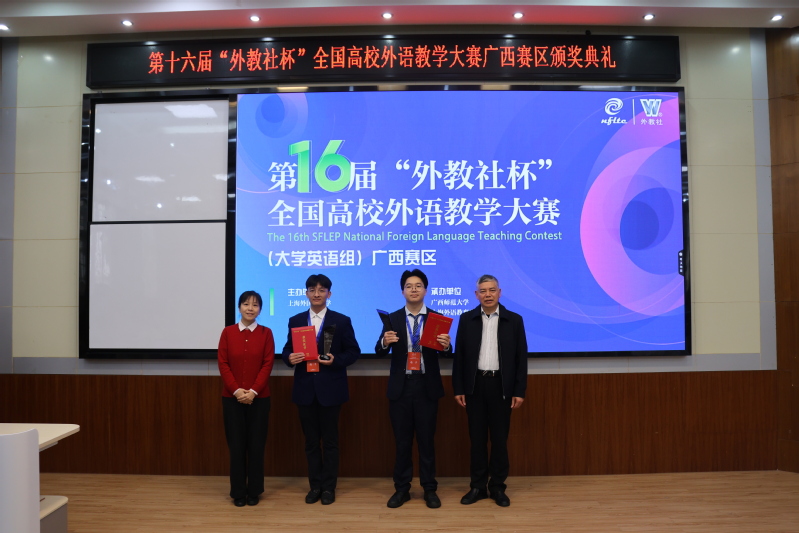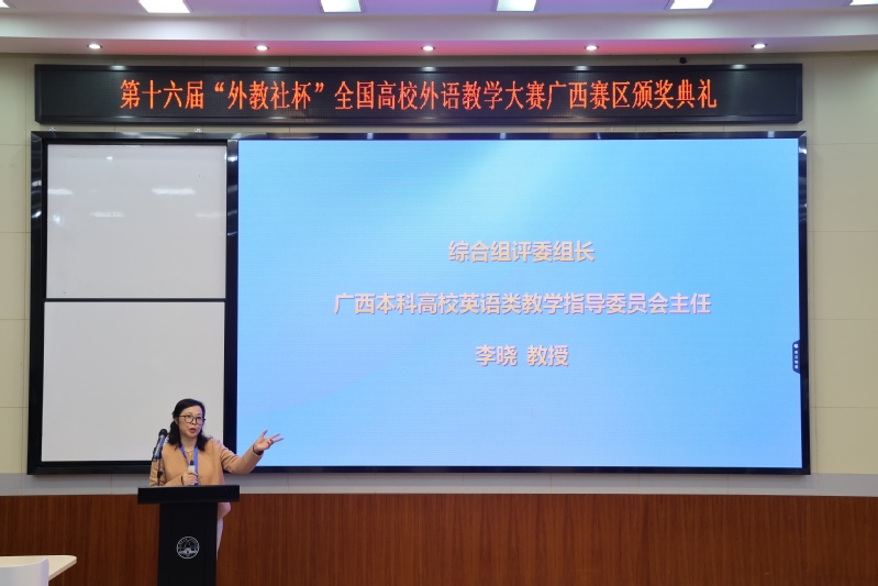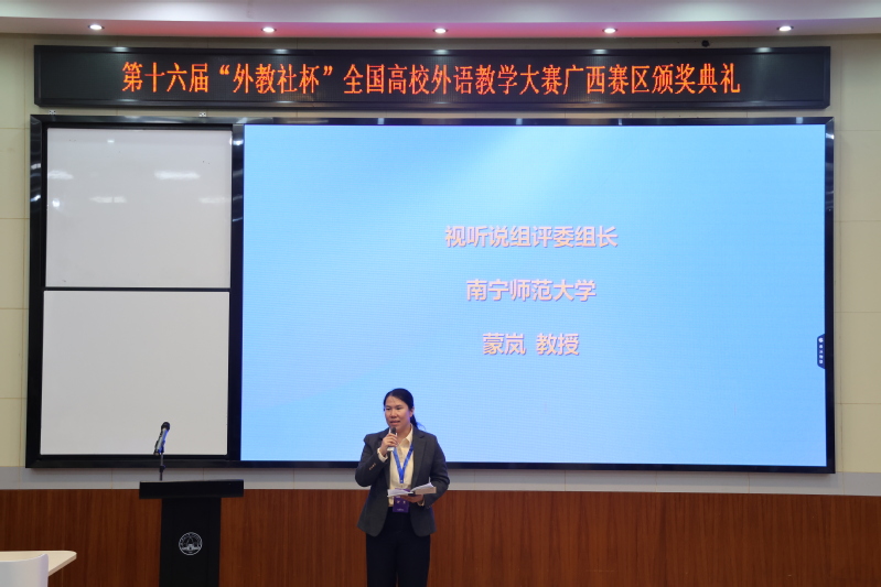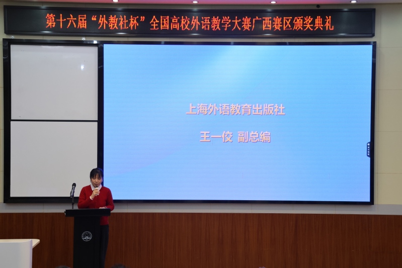 近日,第十六届“外教社杯”全国高校外语教学大赛广西赛区复决赛在广西师范大学举办。广西师范大学党委副书记莫坷、广西高校英语教学指导委员会主任李晓、上海外语教育出版社副总编王一佼、广西师范大学外国语学院院长、南宁师范大学外国语学院教授蒙岚、广西师范大学外国语学院副院长等领导嘉宾以及大赛评委、全体选手共同出席颁奖典礼。