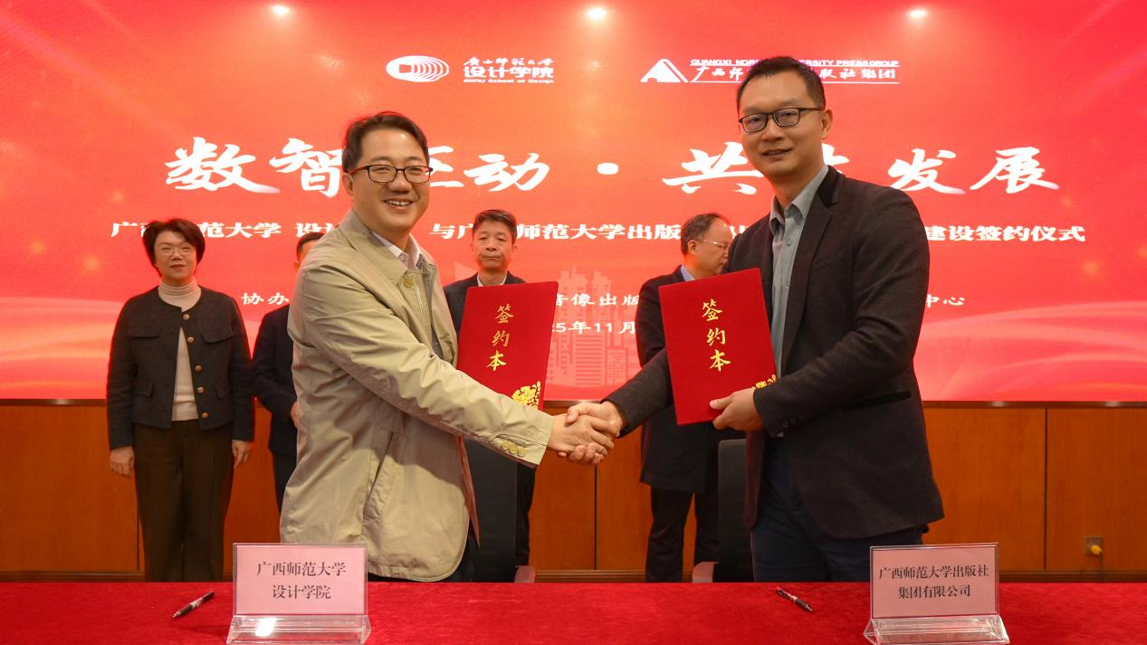 在孙杰远校长等领导见证下,教育学部负责人、设计学院党委负责人分别代表广西师范大学教育学部和设计学院与出版社集团代表、桂林贝贝特电子音像出版社总经理签署了“数字教材出版战略合作协议”。