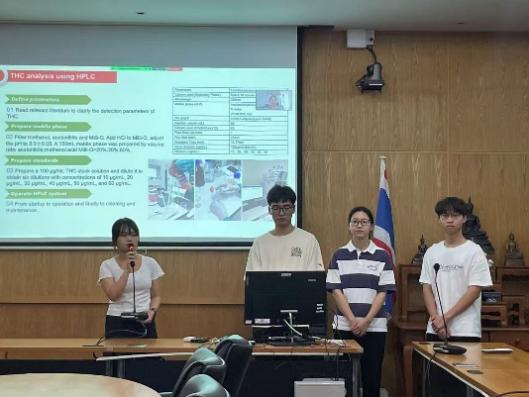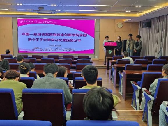 近日,广西师范大学化学与药学学院举办了一场别开生面的泰国实习交流分享会。会上,依托中国—东盟天然药物技术创新学院(以下简称“创新学院”), 刚从泰国宋卡王子大学药学院实习归来的2022级本科生丘华强、原毅彤、李星月、蒋欣霖等四位同学,回顾了在异国他乡的学习实践经历,分享了他们的收获与成长。