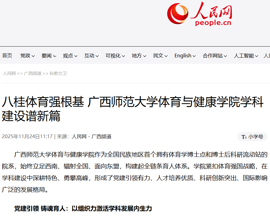 11月24日,【人民网】关注报道我校体育与健康学院作为全国民族地区首个拥有体育学博士点和博士后科研流动站的单位,立足西南、面向东盟,构建起特色鲜明的学科发展体系。我校体育与健康学院强化党建引领,打造“党建+”育人模式,推动“三全育人”走深走实。人才培养方面,体育教育专业入选国家级一流本科专业,建成多门一流课程;学生在国际赛事中获前三名41项,在全国竞赛中获前三名300余项。科研创新上,体育与健康学院整合五大团队聚焦“体医融合”等重点方向,2025年获批国家级项目4项,成果广泛服务军警、消防等领域。国际合作持续深化,与韩国龙仁大学合作办学,推动传统体育赴东盟展演,连续承办中国—东盟体育科学大会。站在新起点,我校体育与健康学院将持续服务体育强国战略,为建设健康中国贡献力量。