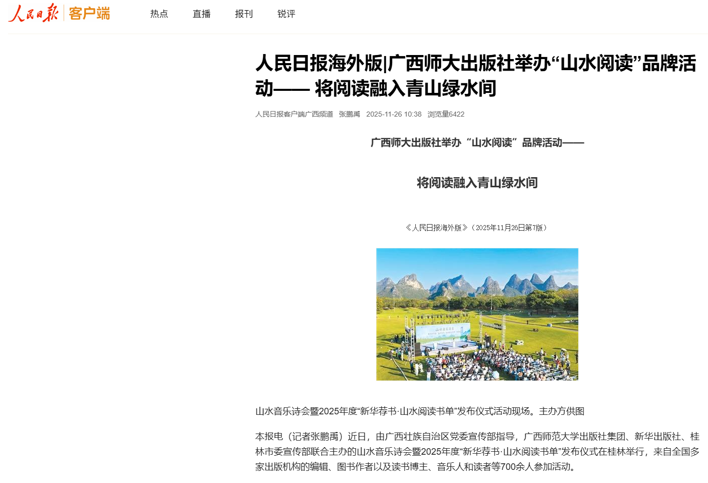 11月26日,【人民日报】海外版关注报道我校出版社集团联合多家单位主办的“山水阅读”品牌活动在桂林举行。该活动是我校出版社集团策划的情境式阅读文化品牌,通过将阅读融入自然山水,构建全民阅读新形态,传播“人与自然和谐共生”的生态文明理念。活动现场发布了2025年度“新华荐书·山水阅读书单”,包括《长江文化读本》等10种图书,出版单位代表以多种形式对图书内容进行了生动演绎。活动选址桂海晴岚国际旅游度假区,在桂林典型的喀斯特山水景观中营造了独特的阅读体验。“山水阅读”系列活动已连续举办3年,从桂林起步,逐步走向南宁、厦门、上海、北京等多个城市,累计举办近百场活动。未来,我校出版社集团将继续推动出版与文旅产业深度融合,深化数字技术应用,打造更多山水场景下的沉浸式阅读体验。
