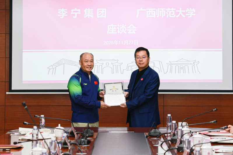 在自由交流环节,双方围绕校企合作、科研创新、人才联合培养等进行了讨论。会前,李宁一行实地考察了广西师范大学雁山校区体育场馆、体育与健康学院、雁栖湖及校史馆。