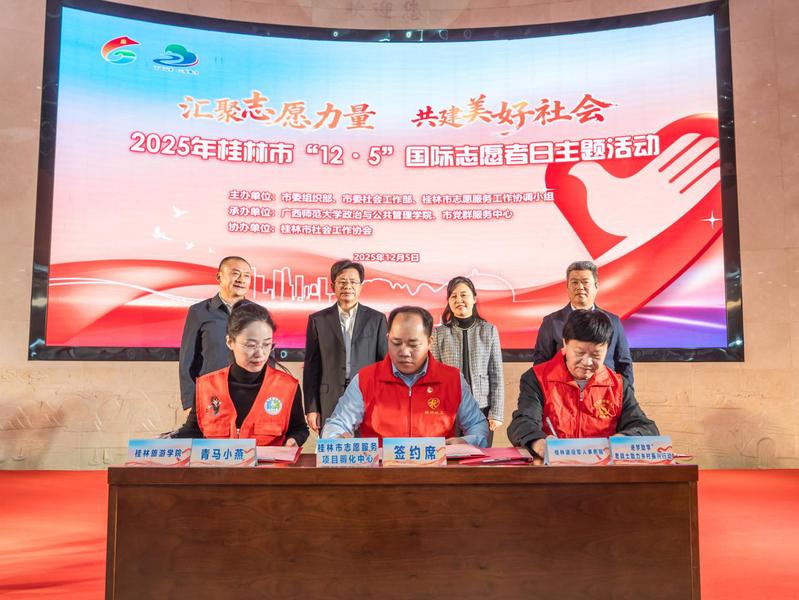 12月5日,正值第40个国际志愿者日,桂林市“12·5”国际志愿者日系列主题活动在市党群服务中心启动。桂林市委副书记罗试坚出席并宣布活动启动。我校党委常委、副校长沈星灿,桂林市委社会工作部部长郑建忠及双方相关单位负责人参加活动。