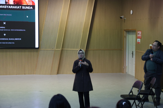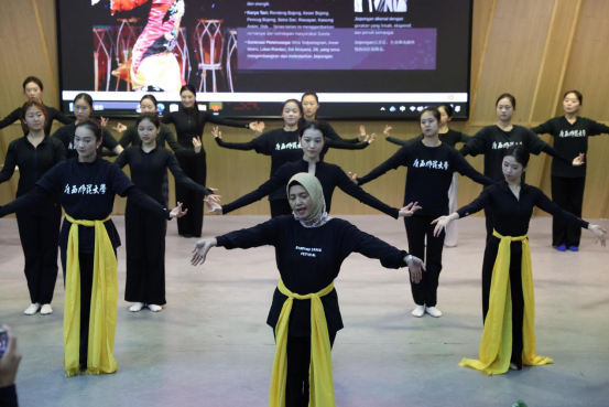 Ai Mulyani Miharja作了题为“印度尼西亚传统舞蹈的文化根脉与当代表达”的专题讲座,系统阐释了印尼传统舞蹈的历史角色以及在当代创作中的转化与创新路径,强调了艺术教育应扎根传统、面向世界的理念。她现场教授印度尼西亚经典舞蹈《Tari Kukupu》(蝴蝶舞),让参与师生深刻感受到印度尼西亚舞蹈的独特艺术魅力。
