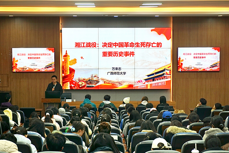 12月14日,学校“中国共产党人精神谱系”专题宣讲活动在雁山校区举行。本次活动邀请马克思主义学院万来志老师主讲,以《湘江战役:决定中国革命生死存亡的重要历史事件》为题,为现场同学带来了一场兼具史实深度与精神厚度的红色学习分享。