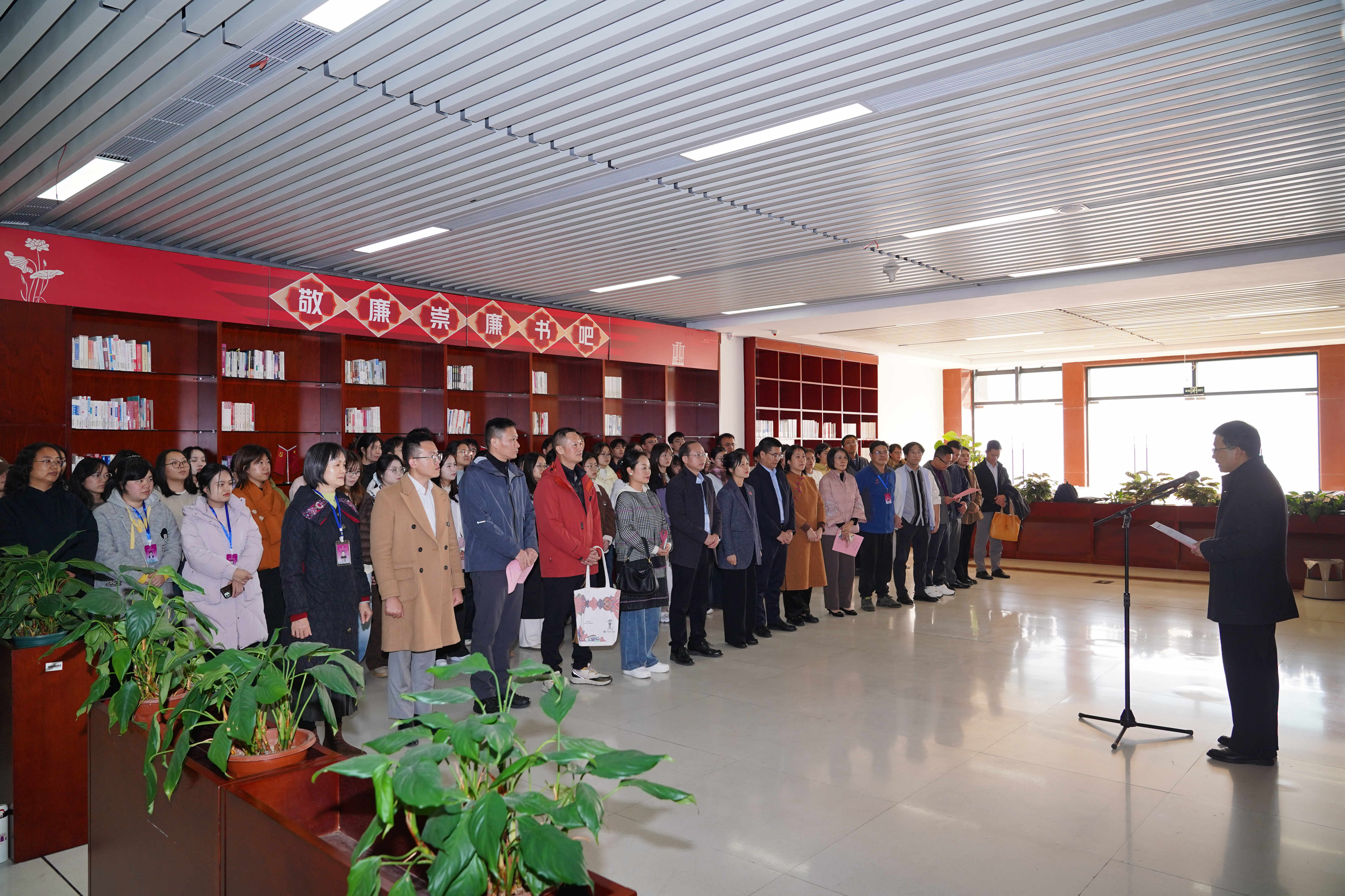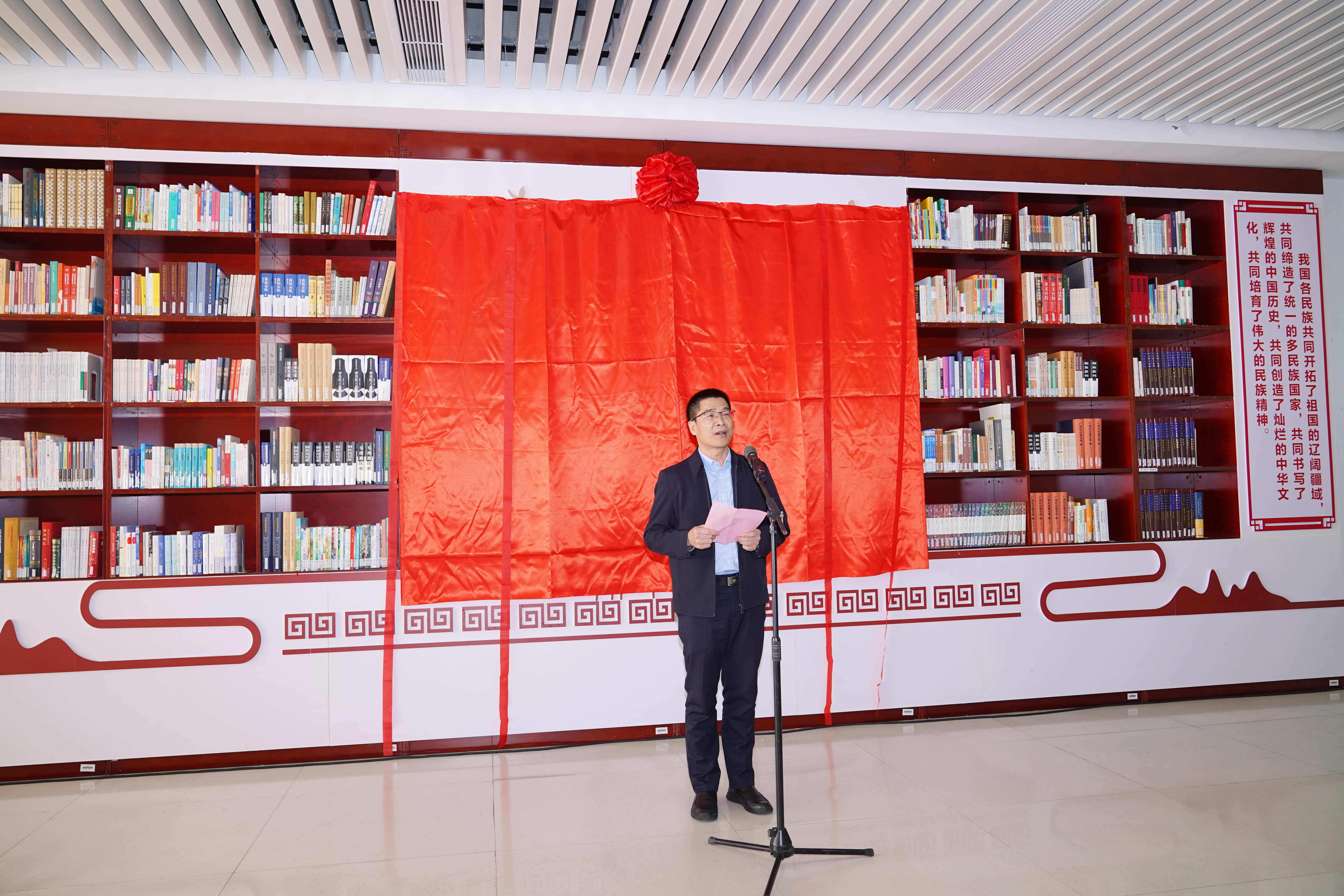 揭牌仪式由图书馆党总支负责人主持,他对各位领导嘉宾的到来表示欢迎,也对“典映中华”展阅品牌落户我校图书馆表示衷心的感谢。