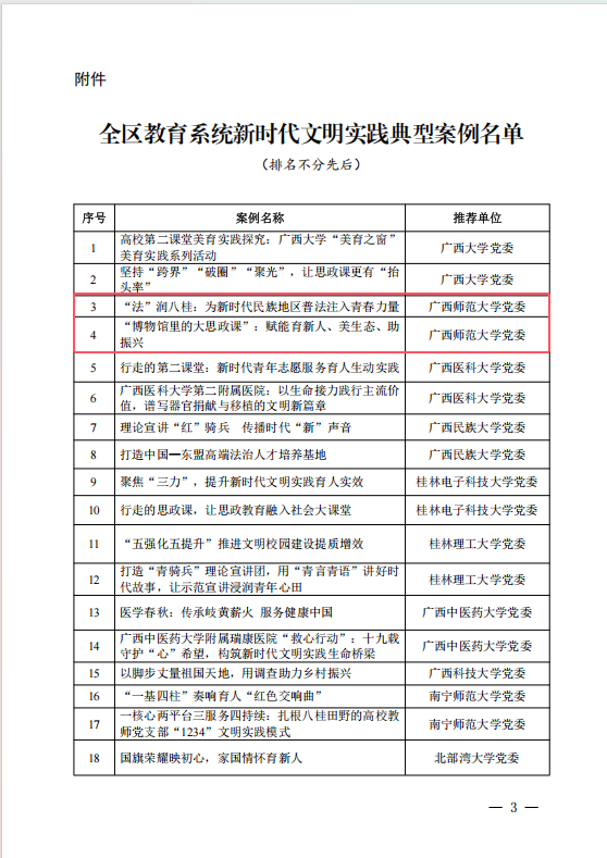 近日,自治区党委教育工委公布入选2025年全区教育系统新时代文明实践典型案例的通知,我校法学院申报的《“法”润八桂:为新时代民族地区普法注入青春力量》项目,我校生命科学学院申报的《“博物馆里的大思政课”:赋能育新人、美生态、助振兴》项目,从众多项目中脱颖而出,成功入选。