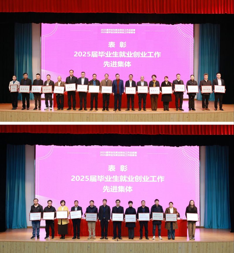 贺祖斌代表学校向受表彰的先进集体和个人表示热烈祝贺,向坚持在就业工作一线的毕业班辅导员和全体工作人员致以衷心感谢。他对2025届就业创业工作取得了可喜成绩进行了充分肯定,同时就进一步做好2026届毕业生就业创业工作提出三点要求:一是要立足大局,提高站位,充分认识高校毕业生就业工作的新定位新使命;二是要认清形势、掌握主动,准确把握毕业生就业工作面临的挑战和困难,三是要聚焦重点、精准发力,多措并举推动实现我校毕业生高质量充分就业。他要求全校上下要锚定目标不放松,铆足干劲抓落实,以“时时放心不下”的责任感,全员联动、攻坚克难,以更高质量的就业推动学校国内一流大学建设再上新台阶。