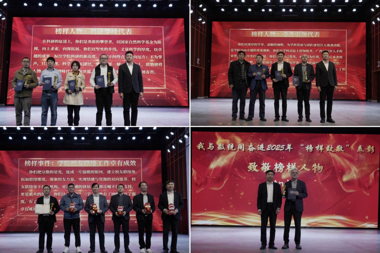 12月19日晚,数学与统计学院在雁山校区举行“我与数统同奋进”2025年“榜样致敬”表彰。学院领导班子成员及师生代表共同参加。广西师范大学党委常委、副书记黄文韬,学院离退休教师代表林庆南,以及院友代表戚绍斌(广西师大校友会数统学院佛山联络处会长、佛山市南海区艺术高级中学校长),周仕栋(桂平市第五中学党委书记),罗羽(玉林第十高级中学副校长),潘汉良(桂平市第一中学校长),谢业生(百色尊龙、龙腾等汽车销售有限公司董事长)等嘉宾应邀出席。此外,玉林桂林商会会长、桂林海威科技集团总经理梁革平,桂林升华建筑有限公司总经理蒋创,桂林市象山区聚贤教育培训学校校长孙中啸等也出席了本次活动。