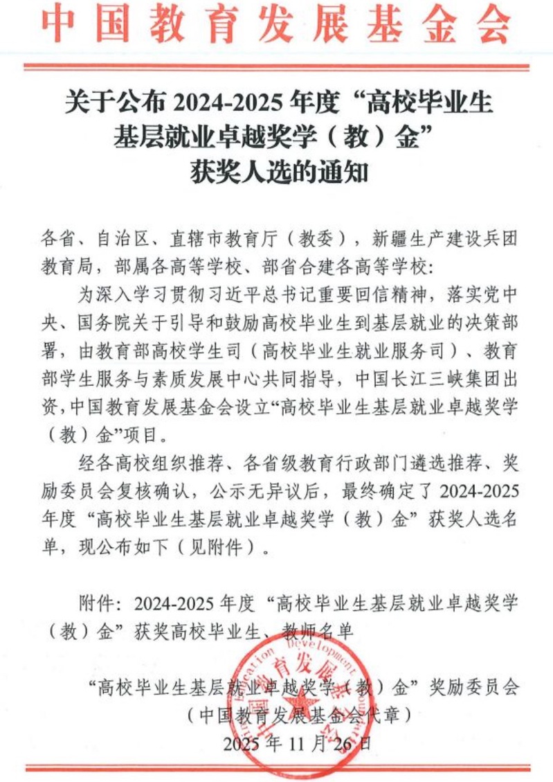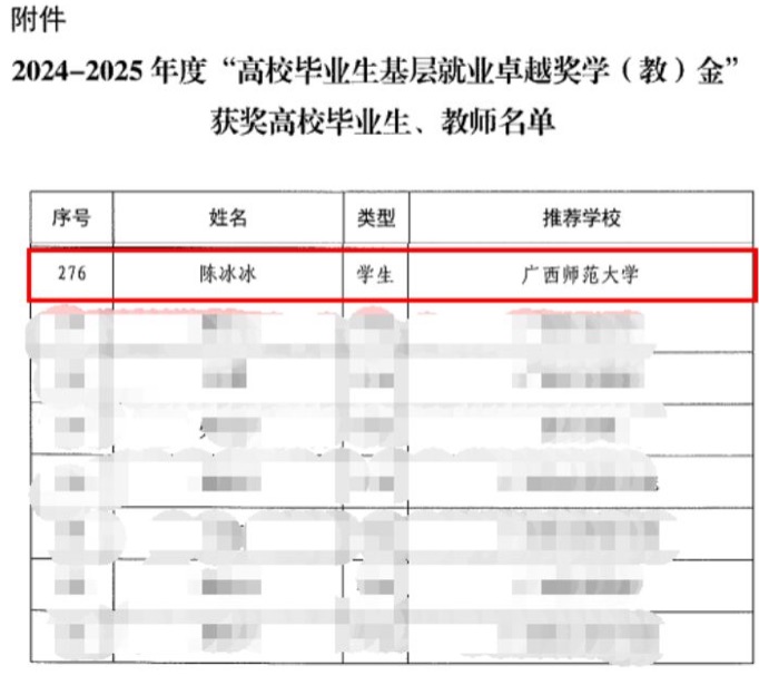 日前,教育部高校学生司(高校毕业生就业服务司)公布了 2024-2025 年度 “高校毕业生基层就业卓越奖学金” 名单,全国高校 418 人、广西高校 13 人获此殊荣。我校始终坚守立德树人根本任务,培养的学生积极响应国家号召,主动到祖国最需要的地方扎根奉献、建功立业,电子与信息工程学院 / 集成电路学院 2017 级电子科学与技术专业本科毕业生、新疆维吾尔自治区疏附县塔什米里克乡宣传办干部陈冰冰便是其中的优秀代表,成功上榜该名单。