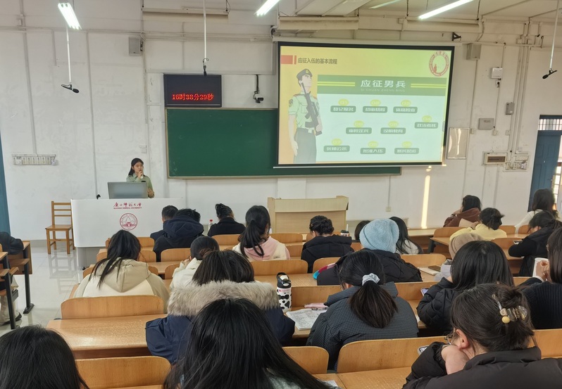 征兵政策宣讲员吴桃结合自身参军经历,就征兵条件、入伍流程及优抚政策等方面进行了详细解读,为有意向参军的学生厘清了报名与发展的具体路径。