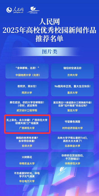 2025年12月27日,以“人工智能赋能教育创新 推动高等教育高质量发展”为主题的人民网2025大学校长论坛在广西大学举行。论坛上发布了人民网2025年高校优秀校园新闻作品名单,我校选送的新闻作品《无上荣光,永久珍藏!广西师范大学获赠天安门广场国旗》荣获图片类优秀作品奖。这是继2023年以来,我校第二次获得此项荣誉,也实现了该类别(图片类)获奖零的突破。