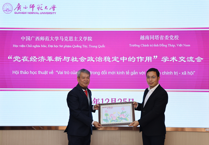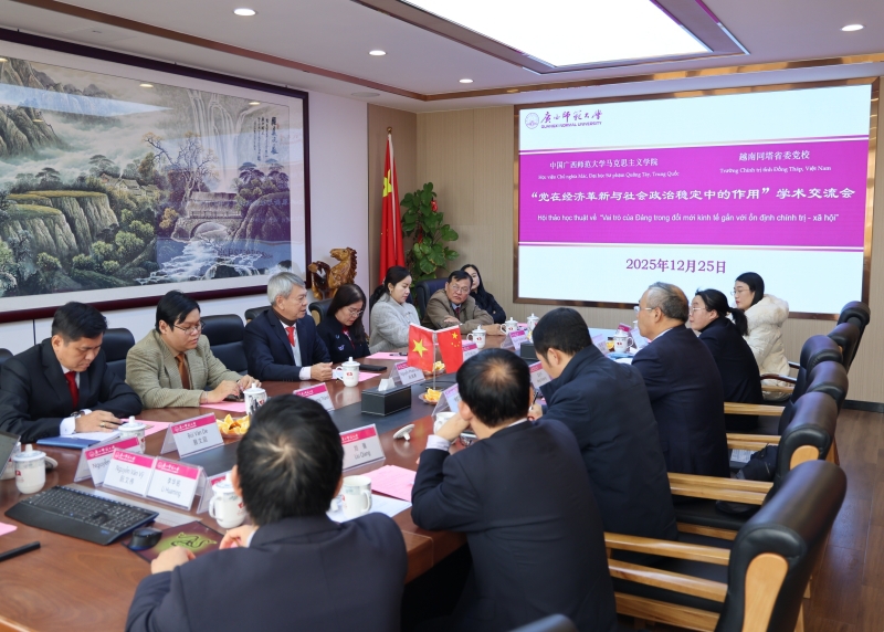 2025年12月25日,以越南同塔省委党校校长阮福勇(Nguyễn Phước Dũng)为团长的越南同塔省委党校代表团一行10人到我校访问交流,并与我校马克思主义学院共同举行“党在经济革新与社会政治稳定中的作用”学术交流会。我校国际文化教育学院、马克思主义学院有关负责人及马院教师代表参加研讨会。