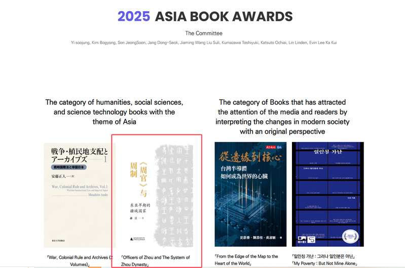 近日,由韩国出版人协会(Korea Publishers Society)主办的2025 亚洲图书奖结果揭晓,出版社集团大学问出品、俞江教授所著的《〈周官〉与周制:东亚早期的疆域国家》,凭借其在先秦史与制度史研究领域的开创性突破,荣获 “年度最佳图书奖”(Best Asian Books of the Year)。评委盛赞其 “构思宏大、论证缜密、结论自洽,是近年东亚早期史领域罕见的学术杰作”,彰显中国先秦史研究成果获国际高度认可。