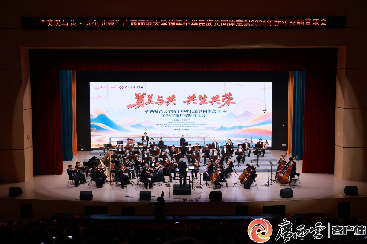 2025年12月30日晚,广西师范大学“美美与共·共生共荣”铸牢中华民族共同体意识2026年新年交响音乐会在雁山校区大学生创新创业中心演艺厅举行。活动以铸牢中华民族共同体意识为主线,旨在通过交响乐这一世界性艺术语言,生动展现中华民族多元一体的文化格局,传递“各民族像石榴籽一样紧紧抱在一起”的时代强音。