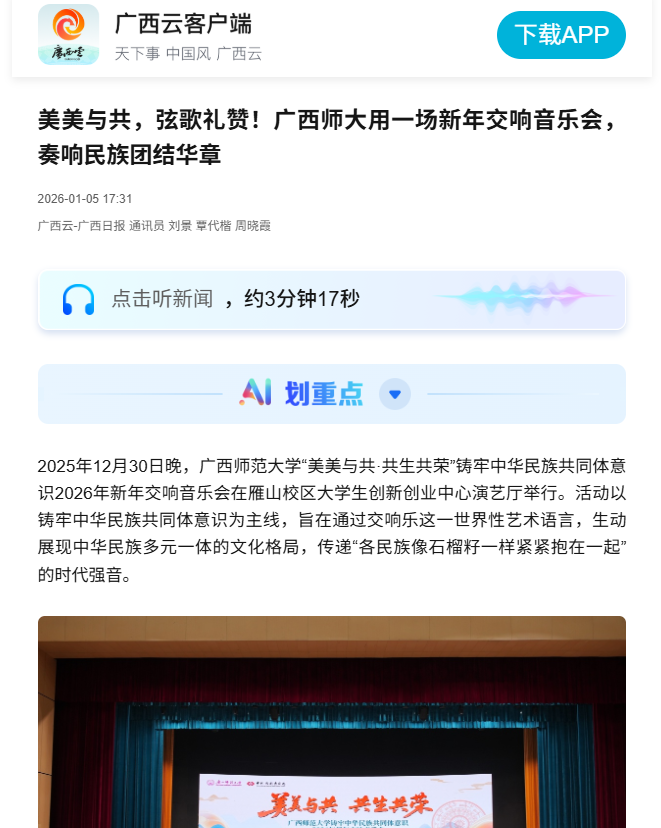 近日,《广西日报》【广西云】关注报道我校在雁山校区举办“美美与共·共生共荣”铸牢中华民族共同体意识2026年新年交响音乐会。音乐会由校美育中心、音乐学院等单位联合承办,并特邀中国歌剧舞剧院交响乐团共同演出,通过交响乐形式生动展现中华民族多元一体文化格局,传递民族团结的时代强音。作为落实“教育强桂”“人文兴桂”战略的重要举措,我校始终紧扣铸牢中华民族共同体意识主线,积极将民族团结教育融入育人全过程。此次活动以艺术凝聚共识,为营造民族团结校园氛围、服务中华民族共同体建设贡献了力量。