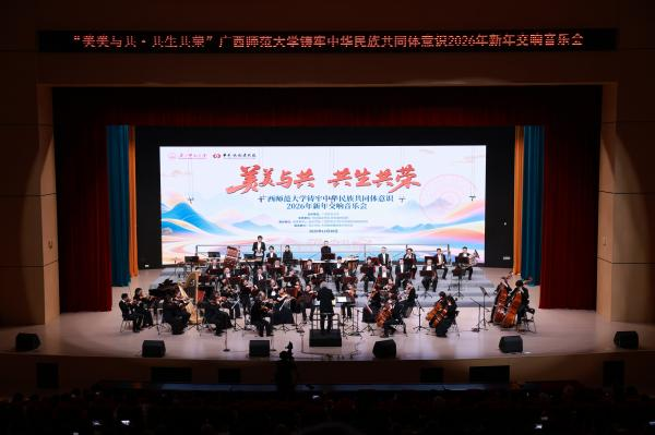 【中国报道网】关注报道我校举办“美美与共·共生共荣”铸牢中华民族共同体意识2026年新年交响音乐会。活动于12月30日晚在雁山校区举行,校领导、各界代表及千余名师生共同观赏。音乐会由校美育中心、音乐学院、中华民族共同体研究院联合承办,携手中国歌剧舞剧院交响乐团演出。指挥家许知俊执棒,歌唱家王铁刚与学校教师同台献艺。曲目融合《春节序曲》等民族经典、多民族风情乐曲及《我爱你中国》等时代旋律,彰显中华美学与交响乐形式的结合。学校紧扣铸牢中华民族共同体意识主线,通过音乐盛宴推进文化育人,凝聚团结共识,服务民族团结进步事业,为谱写中华民族伟大复兴篇章贡献力量。