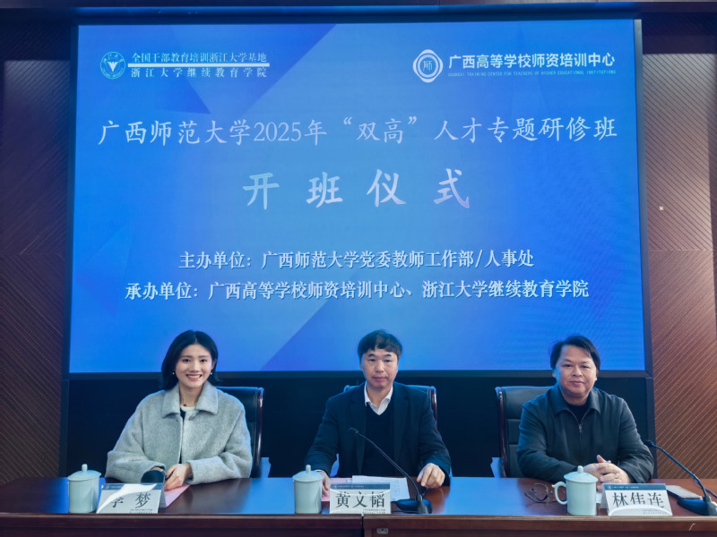 为深入贯彻落实国家教育数字化战略行动,精准提升教师人工智能素养,契合新时代高等教育高质量发展与高层次人才数字化转型需求。2026年1月12日上午,由广西师范大学党委教师工作部/人事处主办,广西高等学校师资培训中心、浙江大学联合承办的广西师范大学2025年“双高”人才专题研修班,在浙江大学正式启动。广西师范大学党委副书记黄文韬,浙江大学继续教育学院院长、党委副书记林伟连出席开班式并致辞。