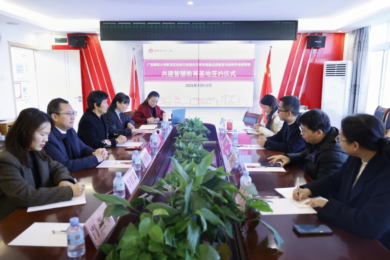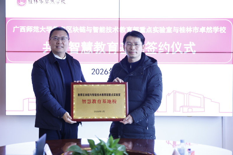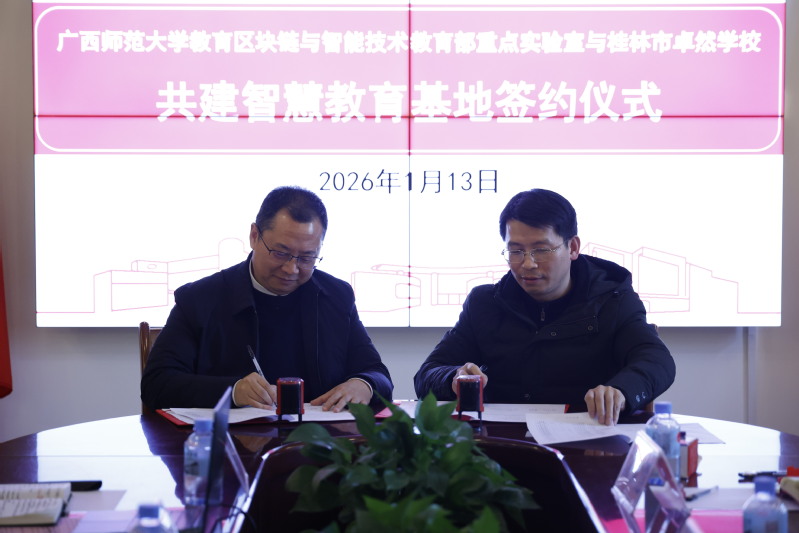 2026年1月13日上午,广西师范大学教育区块链与智能技术教育部重点实验室与桂林市卓然学校共建智慧教育基地签约仪式在卓然学校小学部举行。卓然学校校长张鹏程、广西师范大学计算机学院主要负责人出席活动并讲话。
