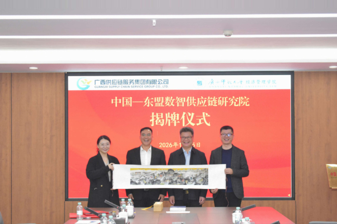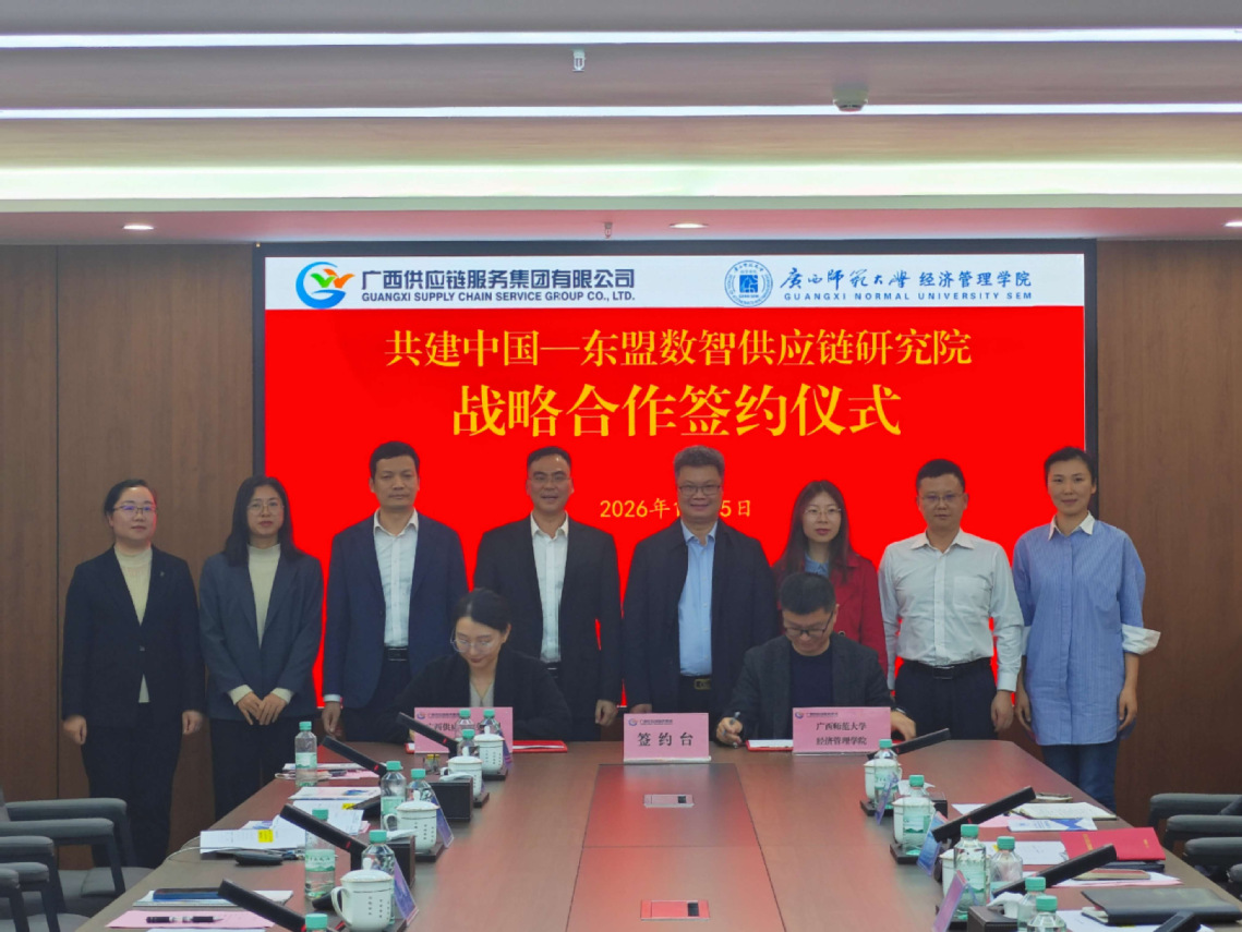 1月15日下午,广西师范大学经济管理学院与广西供应链服务集团在南宁广西现代物流产业孵化中心A座415会议室举行战略合作协议签约暨“中国—东盟数智供应链研究院”揭牌仪式。广西供应链服务集团党委书记、董事长黄兴诚等相关负责人以及经济管理学院领导班子、院长助理、研究生辅导员等出席仪式。