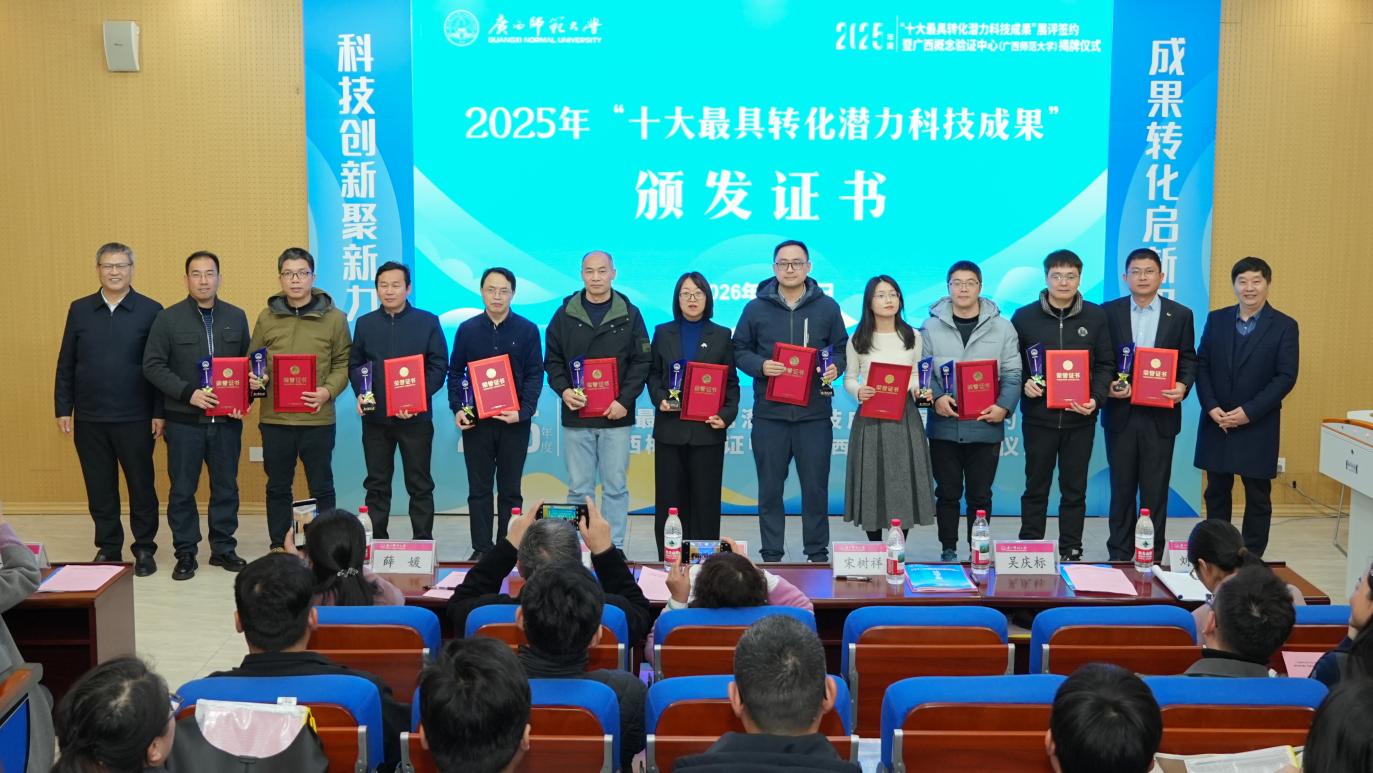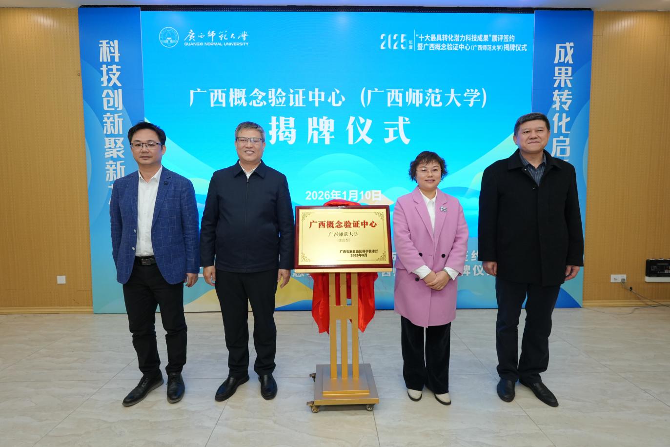 2026年1月10日,我校2025年度“十大最具转化潜力科技成果”展评签约暨广西概念验证中心(广西师范大学)揭牌仪式在育才校区行。桂林市科学技术局、市场监督管理局、七星区、雁山区、高新区等政府部门领导,桂林电子科技大学、桂林理工大学、桂林医科大学、桂林旅游学院等在桂高校代表,润建股份有限公司、桂林银行、广州乐庚信息科技有限公司、广西中政桂创高新技术有限公司、广西昂能生物科技有限公司等企业家代表,以及广西师范大学南宁校友会、桂林校友会的校友代表,及我校师生共120余人齐聚一堂,共同见证学校科技成果转化与创新生态建设的重要进展。