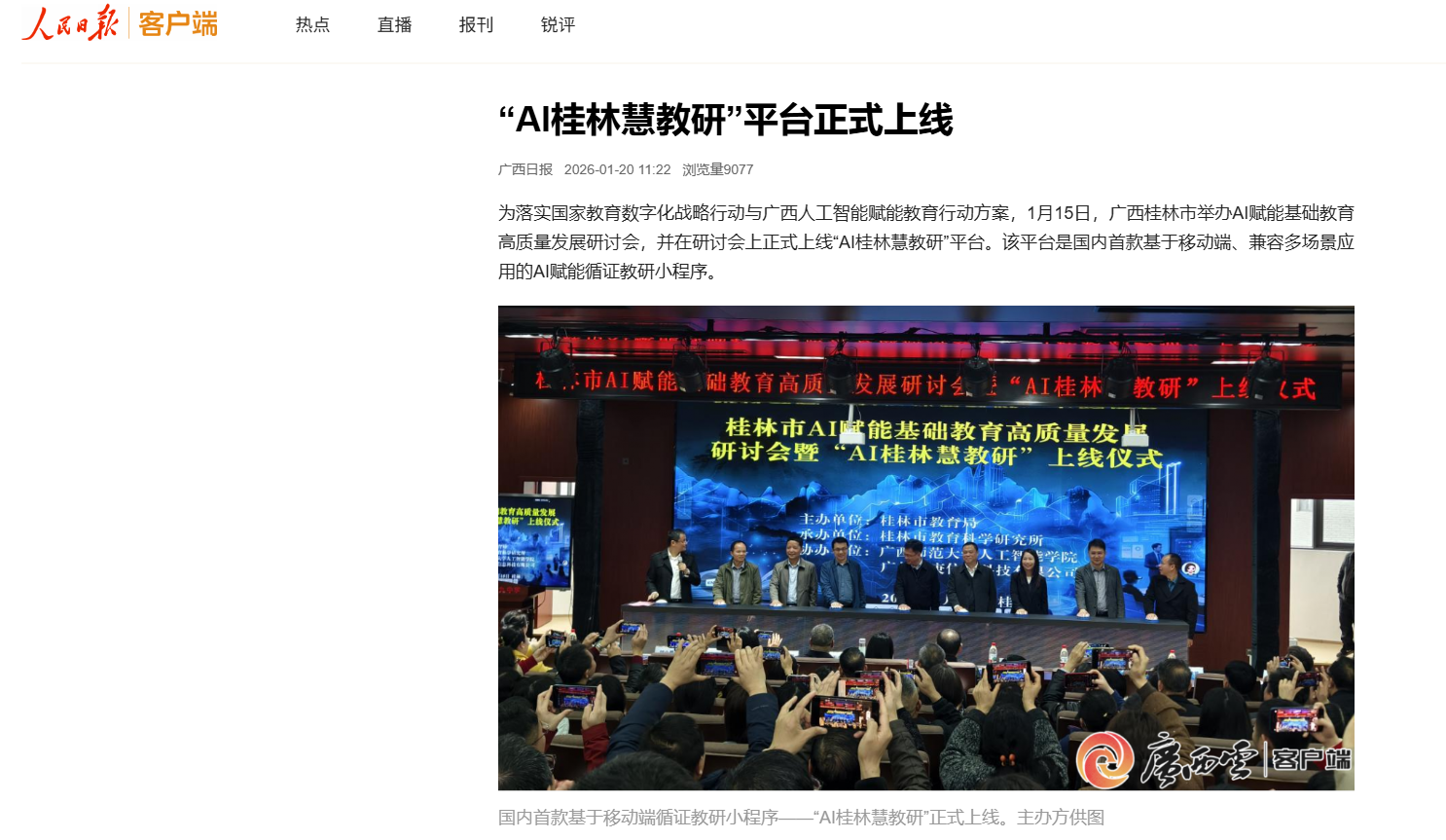 近日,【人民日报】客户端关注报道“AI桂林慧教研”平台在广西桂林市正式上线。该平台是国内首款基于移动端的AI赋能循证教研小程序,由我校人工智能学院、广州乐庚信息科技有限公司等单位共同研发。在研讨会上,桂林市第十九中学的初中物理课例展示了该平台的应用:教师利用AI生成动画辅助教学,并通过“小乐秒阅”系统快速批改作业、生成学情报告,实现精准教学。平台支持循证评课、数据查询与AI分析报告生成等功能,推动教研从“经验驱动”向“数据赋能”转变。作为“科创广西”先行试验区,桂林市正积极探索教育数字化。该平台以我校的技术研发为支撑,旨在深化“人工智能+教育”融合,推动教师走向数据支撑的精准教学,并为区域教研提供可推广的实践样本。