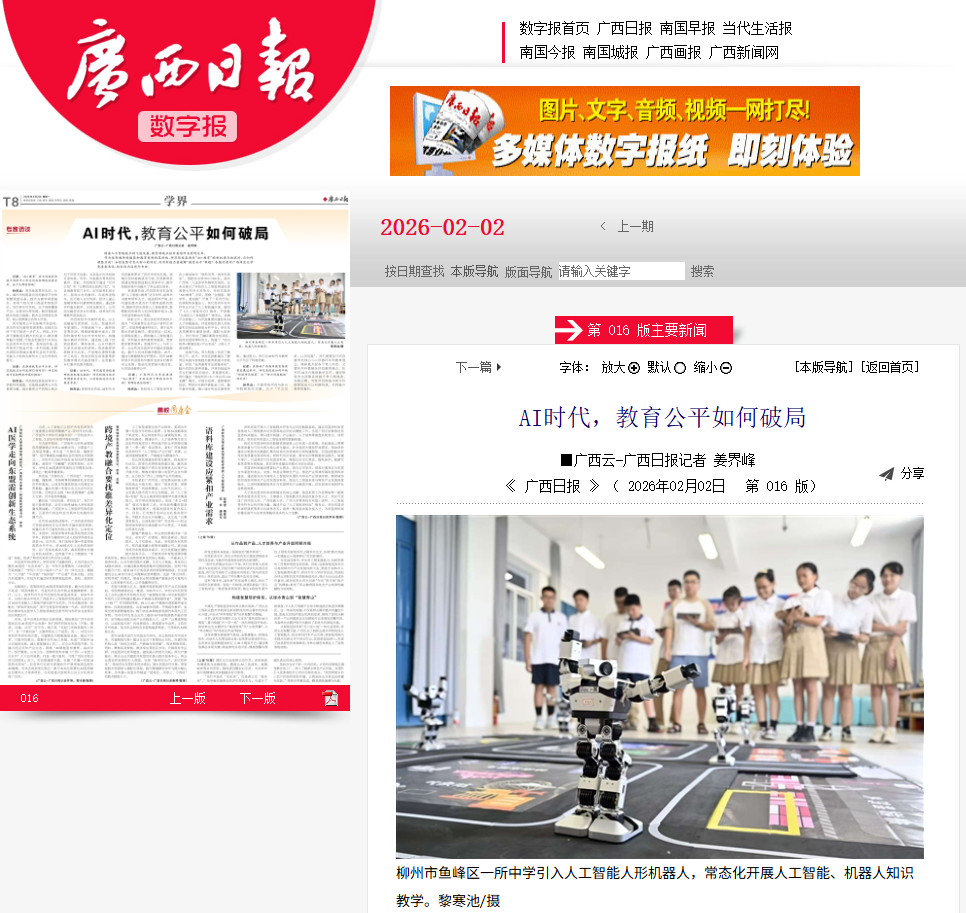 近日,【广西日报】关注报道我校以“守正创新”推动AI时代教育公平。学校通过“优师计划”定向培养乡村教师,并依托名师团队、城乡教研共同体与数字化资源共享,精准输送优质资源。面对AI浪潮,学校大力发展“人工智能+教育”交叉学科,面向全体学生开设通识课,与行业共建实践基地,并研发“独秀教育学生画像系统”赋能师范生培养与乡村教师培训。通过“高校科研+中小学应用+AI支撑”模式,学校开放示范课与虚拟教研,助力乡村教师掌握AI工具,缩小数字鸿沟,实现传统师范根基与新兴科技的深度融合。
