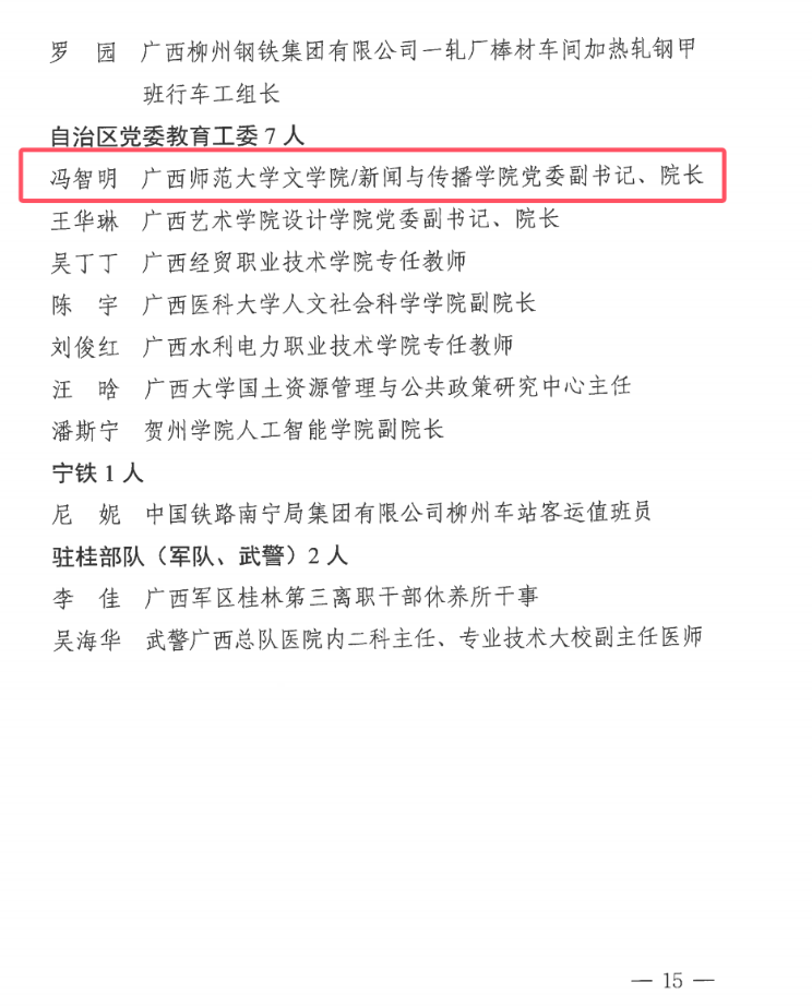 冯智明同志现任广西师范文学院/国际中文教育学院/新闻与传播学院院长,二级教授、博士生导师,并积极投身妇女事业,担任桂林市妇联兼职副主席。从事高等教育工作十五年来,她始终敬业奉献、潜心科研,深耕南岭民族文化研究,主持国家社科基金项目3项,发表论文60多篇,指导学生完成数十项创新创业和社会实践项目。先后荣获“国家民委民族研究优秀中青年专家”“广西文化名家”、广西师范大学巾帼十佳、诚华青年教师奖等多项重要荣誉。