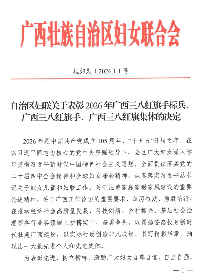 近日,自治区妇联发布关于表彰2026年广西三八红旗手标兵、广西三八红旗手、广西三八红旗集体的决定。我校文学院/国际中文教育学院/新闻与传播学院冯智明同志荣获2026年广西三八红旗手荣誉称号。