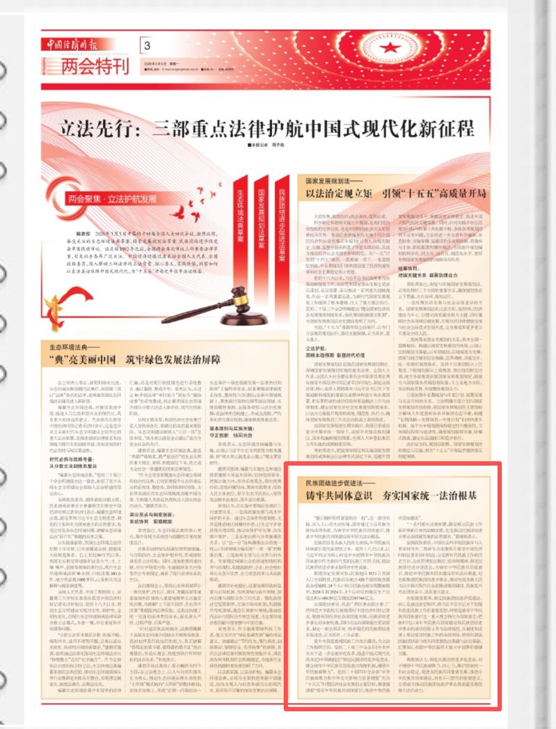 近日,【中国经济时报】刊发题为《立法先行:三部重点法律护航中国式现代化新征程》的报道,聚焦十四届全国人大四次会议提请审议的生态环境法典、国家发展规划法、民族团结进步促进法三部重点法律草案,解读立法背景、核心要义与实践价值。全国政协委员、民进广西区委会副主委、我校副校长黄晓娟接受记者采访,就民族团结进步促进法的立法必要性发表见解。