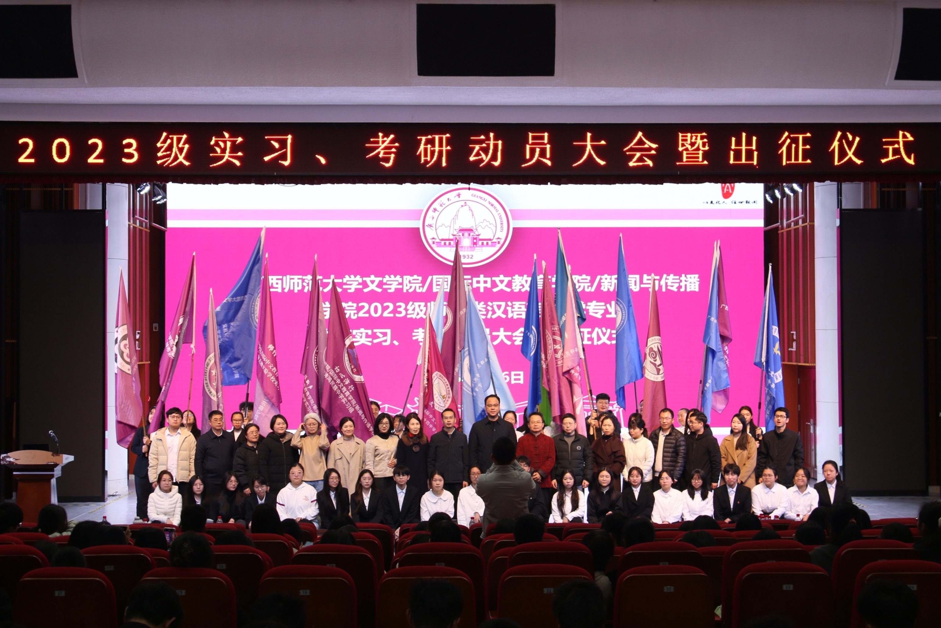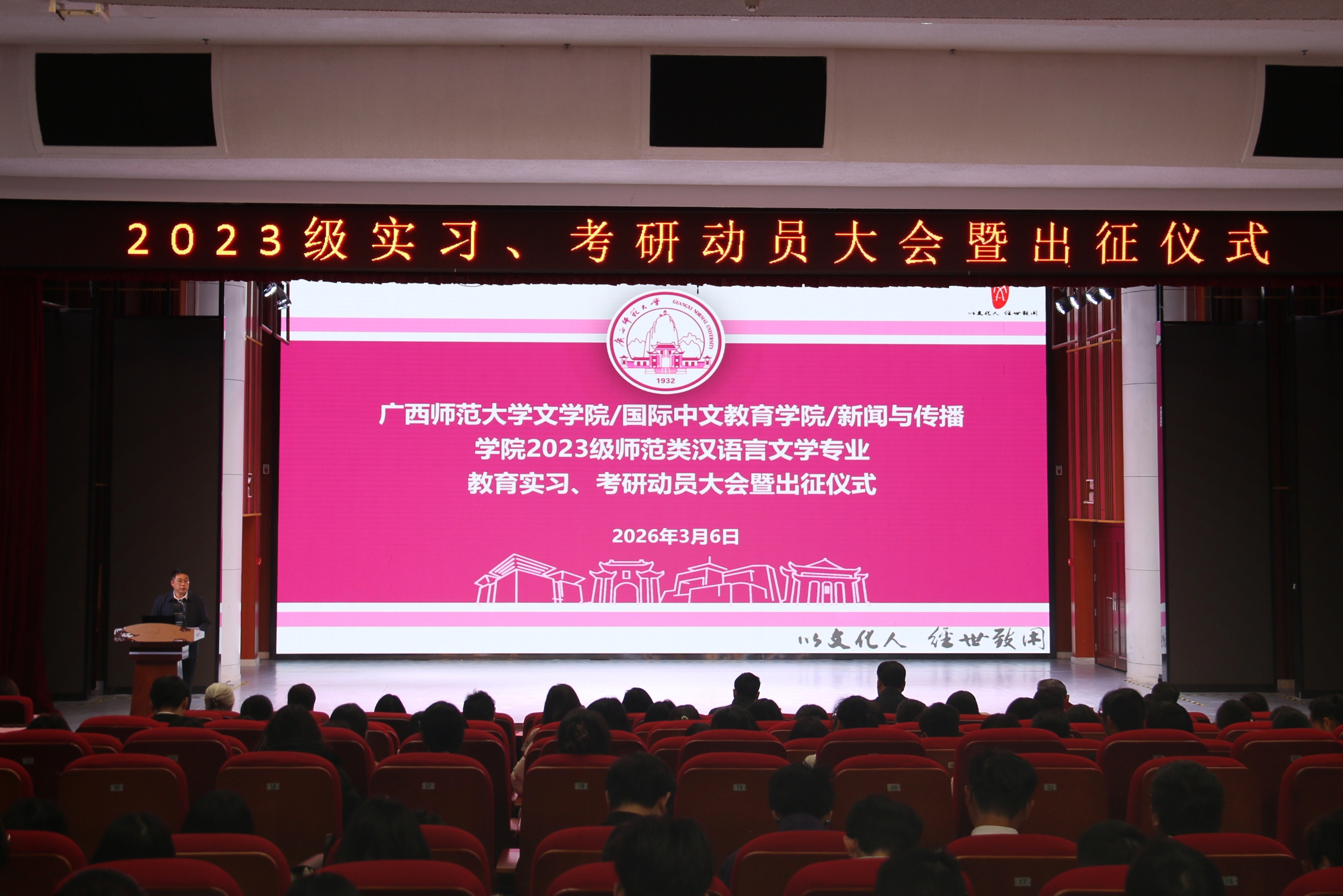 3 月 6 日,文学院/国际中文教育学院/新闻与传播学院在雁山校区三楼综合厅举行2023级师范类汉语言文学专业教育实习与考研动员大会暨出征仪式。学院党委主要负责人、分管教学主要负责人、学生工作相关负责人、校内实习指导老师,以及2023级汉语言文学专业辅导员、全体实习生参加会议。