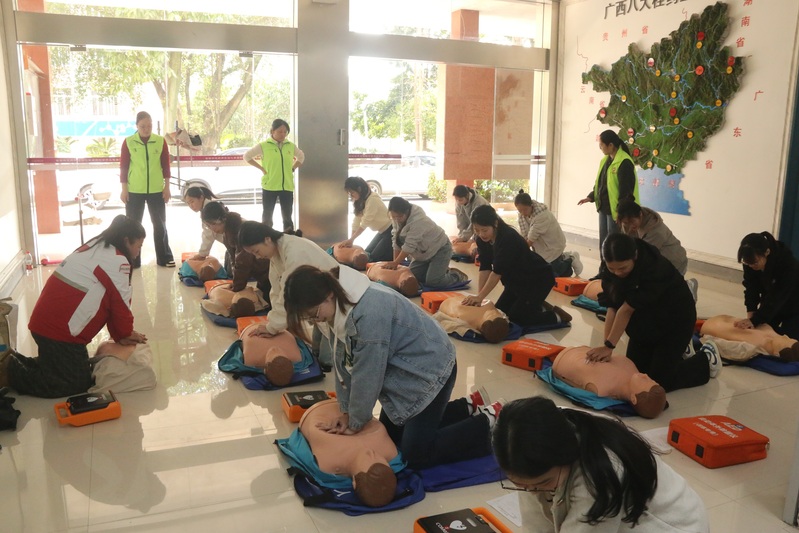 活动伊始,桂林市第五人民医院青年急救志愿服务队讲师,围绕心肺复苏(CPR)核心操作、突发意外现场处置、AED设备原理等内容细致讲解。讲师结合校园晕倒、溺水等真实案例,强调心脏骤停“黄金4分钟”的抢救关键期,用通俗语言拆解专业知识,将复杂医学原理转化为可操作要点,让同学们深刻认识到掌握急救技能对自身与他人安全的重要意义。