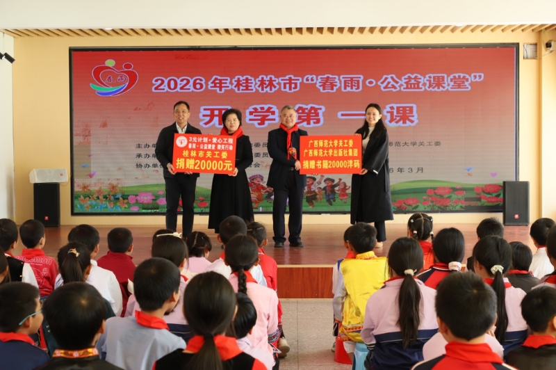 为深入学习贯彻落实习近平总书记关于加强和改进民族工作的重要思想,全面贯彻落实习近平总书记关于关心下一代工作的重要指示批示精神,切实护航青少年健康成长,近日,由广西师范大学关工委、市关工委、市委老干部局联合举办的2026年“春雨·公益课堂”开学第一课走进雁山区草坪回族希望小学,通过捐资助学、捐赠书籍、法治讲座、文艺表演等方式,在孩子们心中种下希望、种下法治、种下艺术养分,用心用情守护各族少年儿童健康快乐成长。桂林市关工委常务副主任石春莲、广西师范大学离退处处长、关工委副主任蒋拥军以及学校关工委、雁山区教育局有关负责人参加“春雨·公益课堂”。