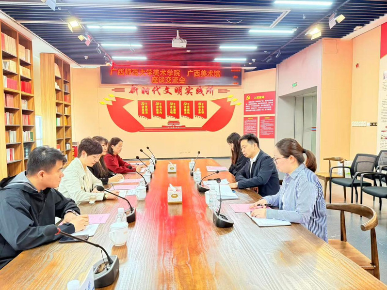 广西美术馆主要负责人对学院一行的到来表示热烈欢迎,并全面介绍了美术馆在展览策划、艺术收藏、公共教育、学术研究等方面的建设成效。他强调,美术馆作为传承优秀文化、传播艺术魅力的重要阵地,同时也是衔接高校艺术教育与社会艺术需求的关键纽带,肩负着培育艺术人才、推动区域文化艺术事业发展的重要使命。期待与广西师范大学美术学院建立长期稳定的合作机制,整合双方优势资源,携手探索符合时代需求的艺术人才培养新路径,共同为培养适应社会发展需要的高层次应用型艺术人才、助力广西文化建设贡献力量。