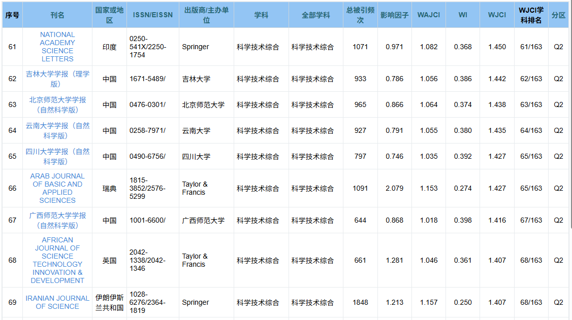 近日,中国知网发布了《科技期刊世界影响力指数(WJCI)报告》2025版(以下简称WJCI),《广西师范大学学报(自然科学版)》再次入选,最新WJCI指数为1.416,在收录的全世界163种科学技术综合期刊(包括Nature、Science等国际期刊)中排第67名(位于Q2区),在收录的49种中国科技期刊(含《科学通报》、National Science Review等)中排第22名,在高校综合性自然科学报中排第11名,在师范大学自然科学报中排第2名。