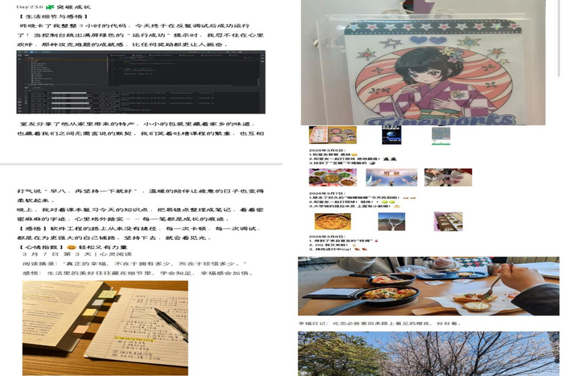 学院同步推出“21天幸福打卡成长计划”,围绕幸福日记、阳光运动、心灵阅读、艺术疗愈、善意行动等内容,引导同学们打破日常惯性,重新发现生活之美,逐步养成积极乐观的生活习惯,提升整体幸福感与心理健康水平。