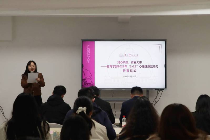 3月25日,教育学部2026年“润心护航,青春无恙”心理健康活动月开幕式在雁山校区容园学生社区朋辈心理帮扶中心举行。本次活动依托学部心理学一级学科博士点、硕士点专业优势,联合广西师范大学心理健康中心,着力构建体系化的心理健康支持机制,助力学生提升心理韧性,营造温暖包容、积极向上的校园心理氛围。