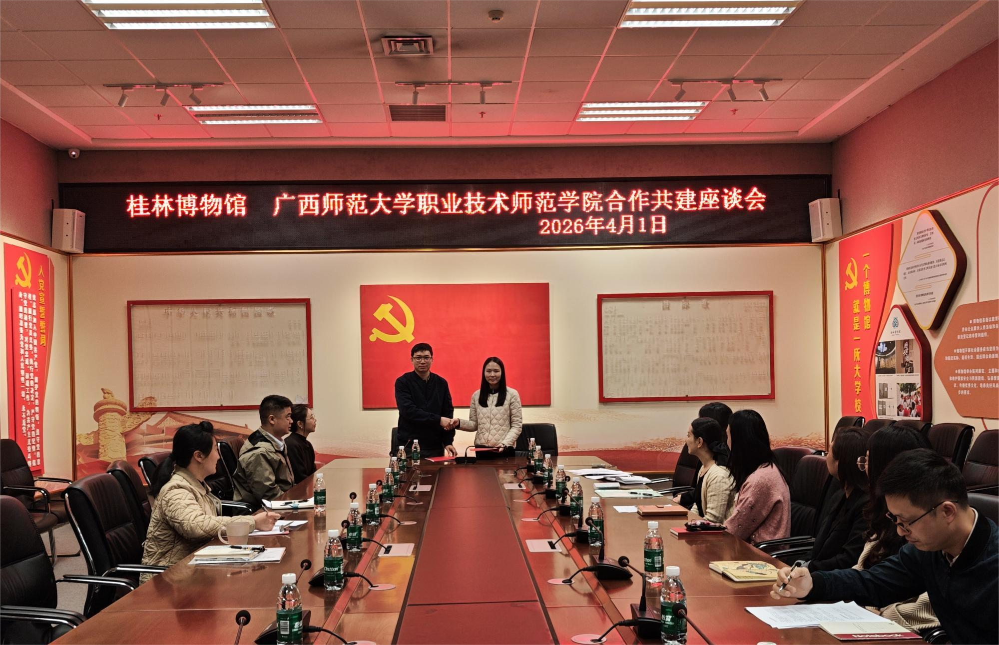 为深化产教融合,推进校馆协同育人走深走实,扎实开展访企拓岗促就业专项行动,4月1日,职业技术师范学院与桂林博物馆合作共建座谈会暨研学实践活动在桂林博物馆举办。双方现场签署合作共建协议,同步开展课程研学、文旅项目专题研讨,携手探索以课程为依托、以实践为抓手的文旅融合育人新路径。